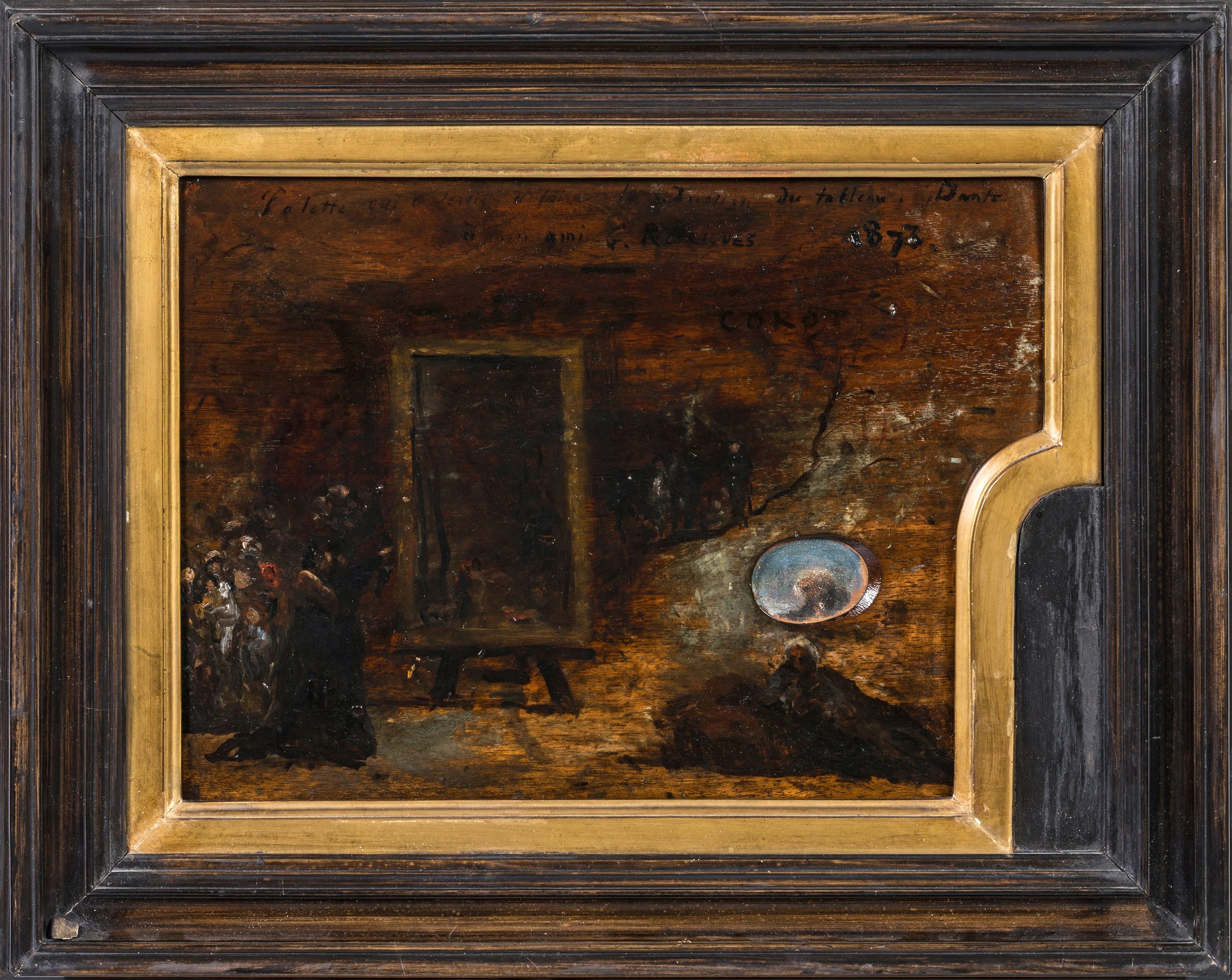 Corot passe à ce moment de réguliers séjours chez son disciple et ami Georges Rodrigues-Henriques (1830-1885) au château des Lions à Port Marly. Agent de change, Georges Rodriques s'adonne à la peinture en amateur et accueille avec générosité ses amis artistes dans sa maison de famille. Charles Daubigny, Eugène Delacroix, Alexandre Dumas et Eugène Labiche sont des habitués. Au mois d'août 1872, Corot passe une dizaine de jours aux Lions, où il peint dans sa dernière manière de maturité. L'exposition en 2001 au musée Thyssen-Bornemisza à Madrid autour du "Parc des Lions à Port-Marly" peint cette année-là fut l'occasion de rappeler les liens forts entre Corot et Rodrigues. Cette palette est offerte l'année suivante par Corot à son ami. Elle est comparable à celle conservée par le musée du Louvre, datée de 1855 (OD 16), dont on reconnaît le modèle sur l'autoportrait de 1825 (musée du Louvre, RF1608). Elle est toutefois en bon état et n'est pas recouverte de taches de peinture, le maître ayant choisi de la peindre. Il a naturellement représenté sa grande toile du Dante et Virgile sur un étonnant fond japonisant ponctué de visiteurs, en prenant soin de remplir le vide réservé au pouce par une toile sur laquelle il a situé un personnage.