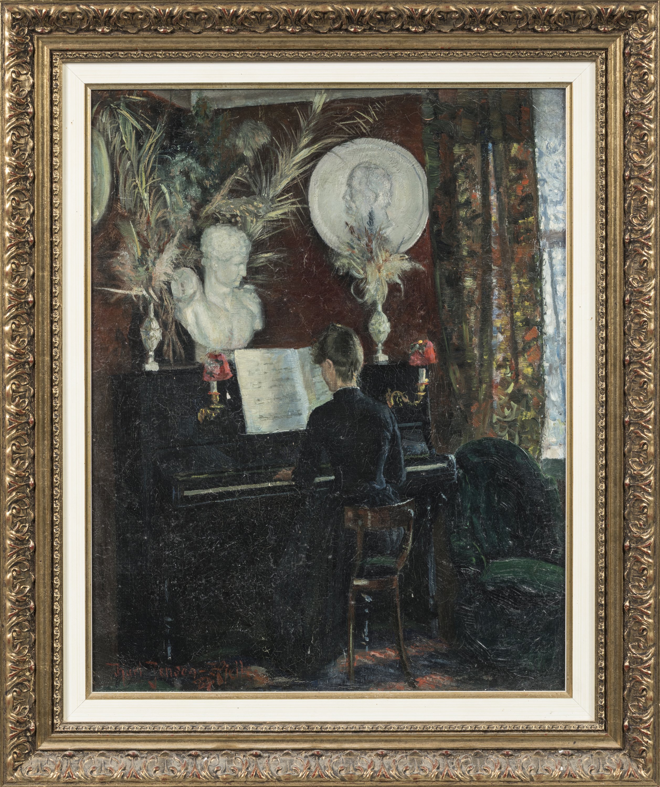 Karl Gustav Jensen-Hjell. A painting featuring a woman playing the piano in her living room. Oil on canvas in a giltwood frame. Signed and dated.