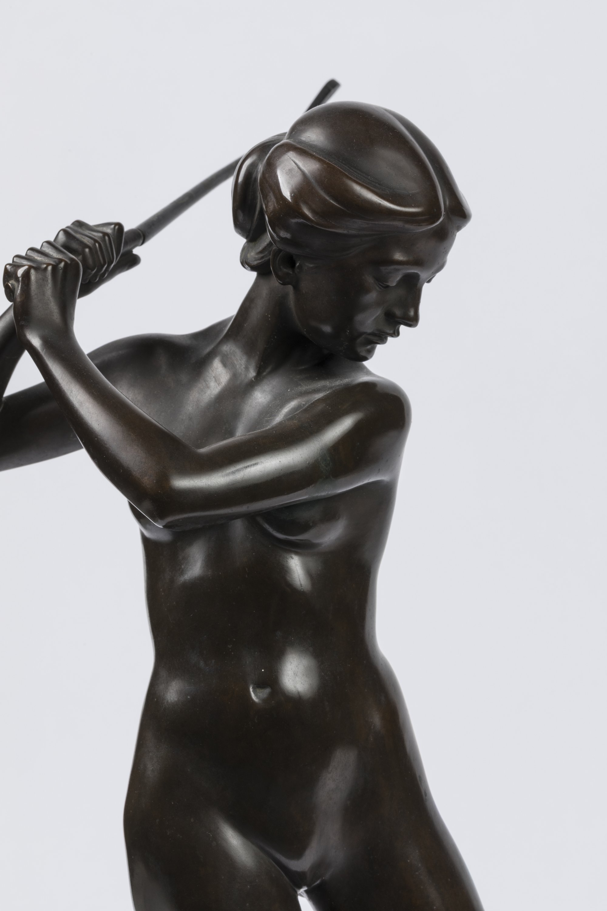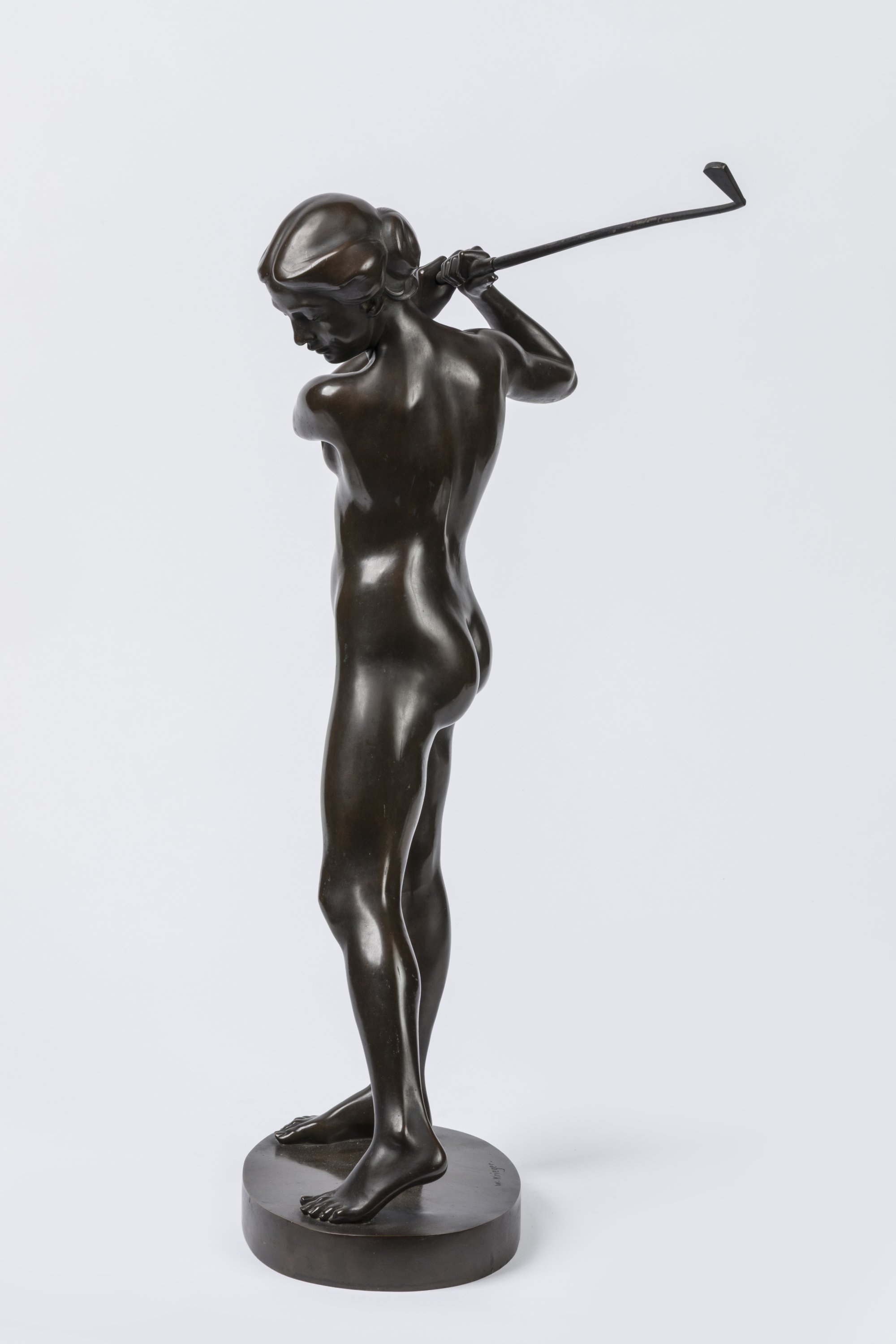Wilhelm Krieger. A ca. 1910 bronze sculpture of a naked female golf player. Signed.