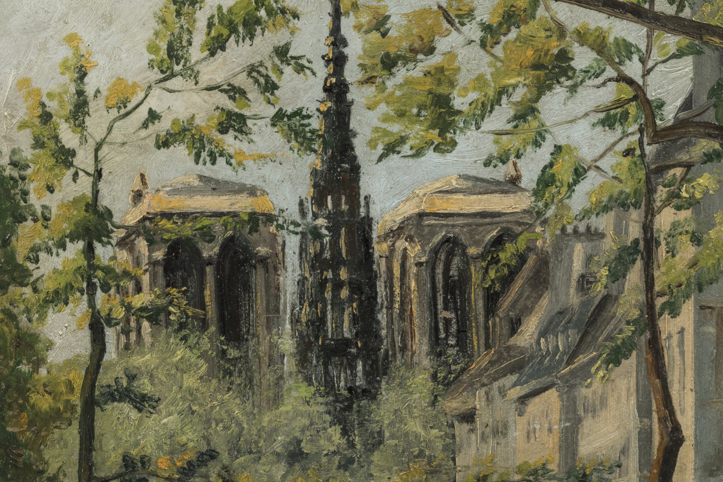 A partir de 1910, Maurice Utrillo décide de se tourner vers des compositions de plus grande ampleur. Il reproduit ainsi de nombreuses églises de région parisienne, comme l’église de Clignancourt ou la Cathédrale de Rouen. L’influence de Claude Monet est particulièrement prégnante sur l’un des plus fameux tableaux de cette série, « Notre Dame », peint dès 1909 et aujourd’hui conservé au musée de l’Orangerie à Paris (n°1963 103). Réalisée en 1919, cette vue de Notre Dame de Paris est totalement inédite. La flèche et les tours de la cathédrale avec le transept nord sont saisis entre les feuilles des floraisons printanières depuis le jardin de l’archevêché. Le monument émerge, presque comme par miracle, au milieu d'un camaïeu de vert. A mi-chemin entre sa période blanche et sa période colorée, comme en atteste la place accordée à la végétation et la teinte gris-beige des pierres, cette toile s'inscrit à un moment particulièrement difficile pour Utrillo, qui enchaîne les internements dans la clinique du docteur d'Allone, rue de Picpus, et triomphe dans le même temps aux enchères et dans les galeries, notamment en décembre 1919, célébré par sa deuxième exposition personnelle, chez Lepoutre, rue de La Boétie.