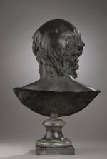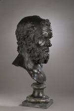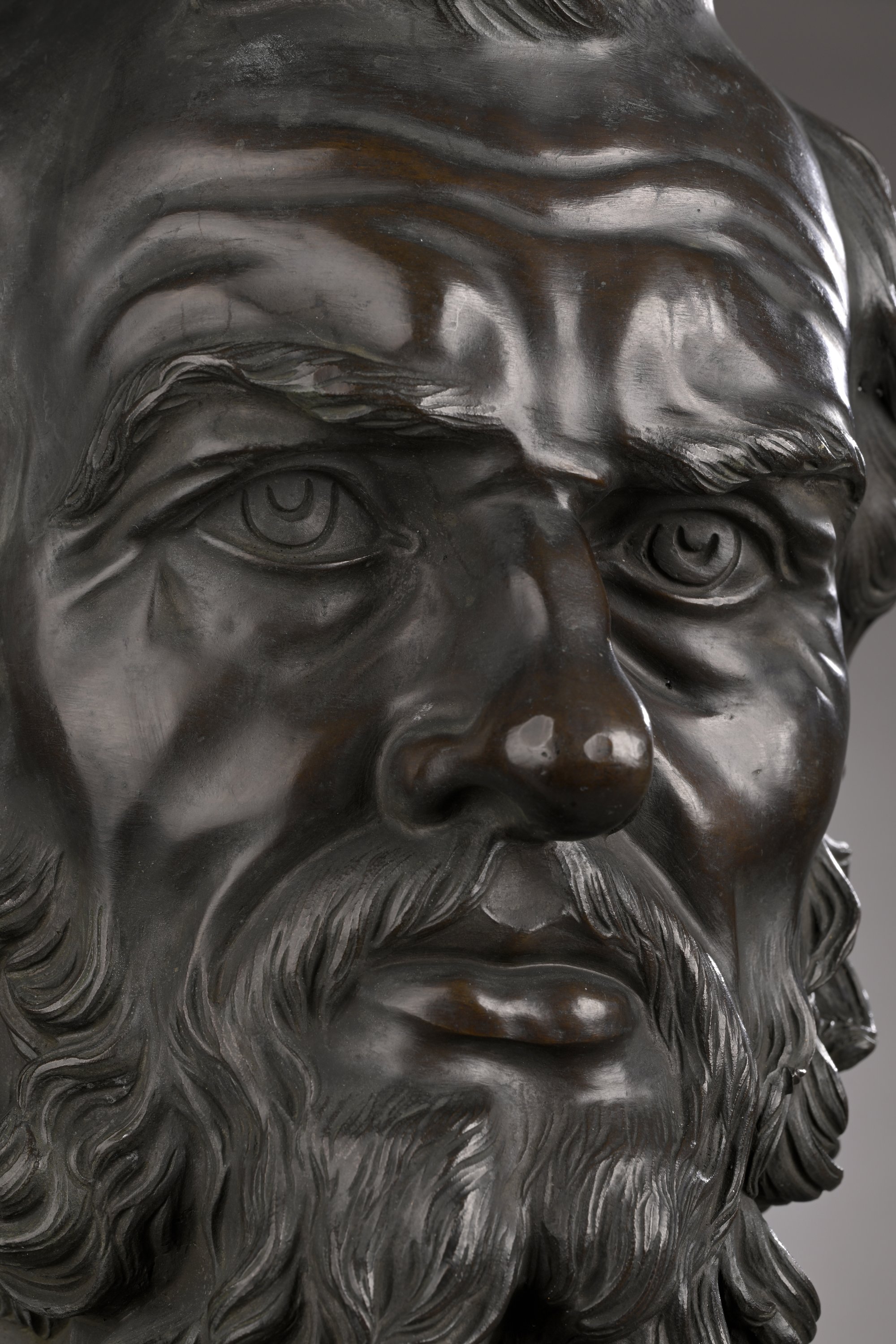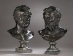 A pair of bronze busts of philosophers. Grey marble bases. Roman School, 17th century.