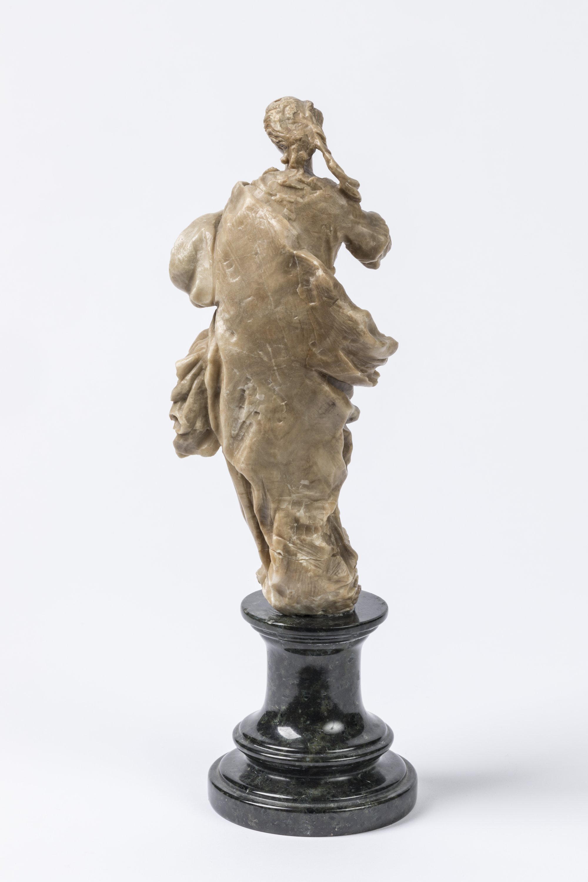 A ca. 1700 alabaster figure of the Virgin of the Assumption. On a grey marble base. Italian School.