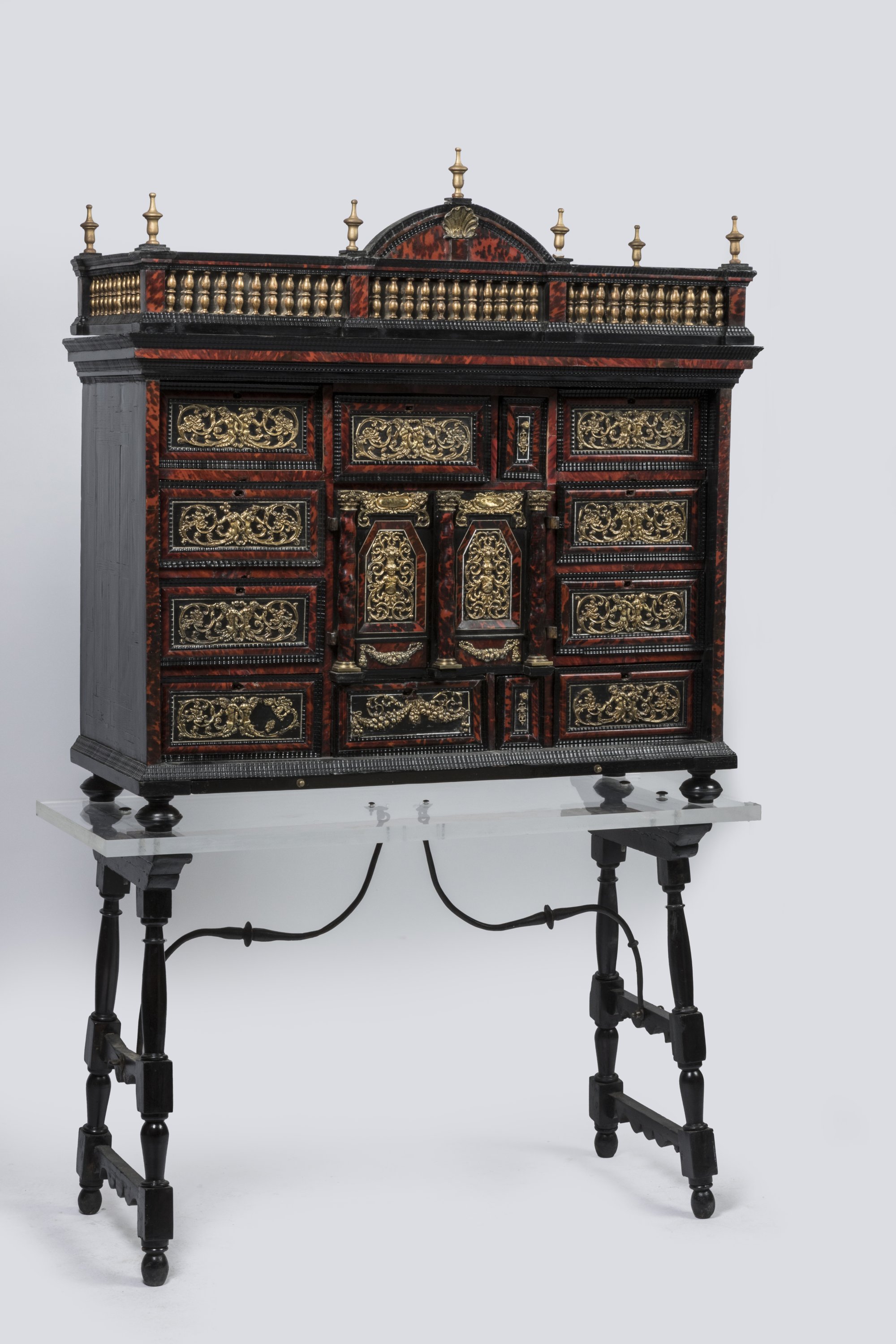 Si le cabinet est à l'origine un meuble utilitaire accompagnant son propriétaire au gré de ses voyages, il devient au XVIIe siècle un objet de prestige. Les Flandres se présentent comme l'une des régions les plus prolifiques dans sa création à base d'ébène et d'écaille. Les matériaux employés sont le reflet des interactions commerciales de la première mondialisation qui se met en place. Les formes baroques sont quant à elles insufflées par les voyages des artistes, à commencer par Pierre-Paul Rubens. Revenu s'installer à Anvers en 1608, Rubens rapporte avec lui des croquis de formes nouvelles esquissés lors de ses séjours d'études et diplomatiques en Italie et en Espagne. "De fait, il introduisit dès lors les formes et idéals baroques dans le nord de l'Europe et eut une influence indirecte sur le cabinet, dont les proportions devinrent plus généreuses, le décor plus audacieux et l'exécution plus homogène" explique Monique Riccardi-Cubitt ("Un art européen. Le cabinet de la Renaissance à l'époque moderne", Paris, Les éditions de l'Amateur, 1993, p. 79).