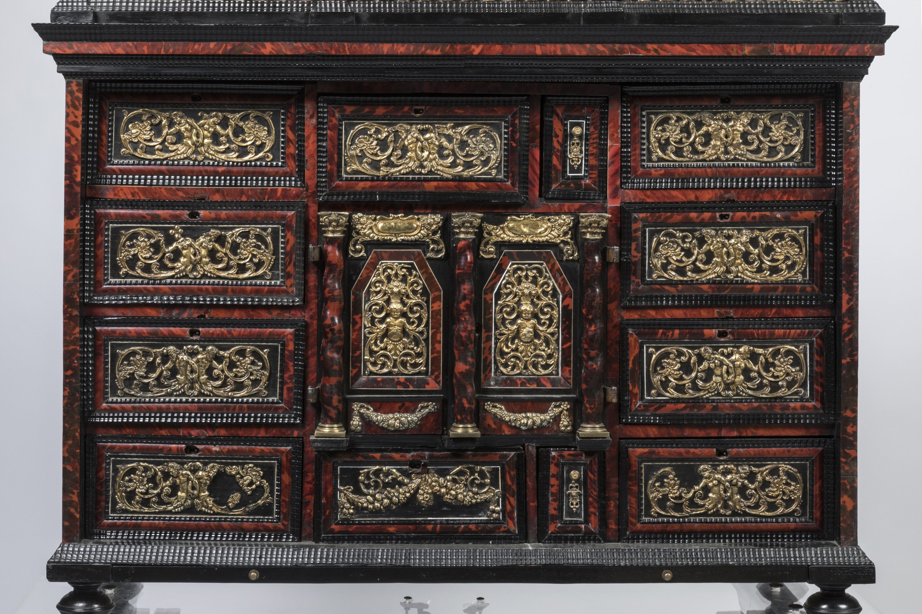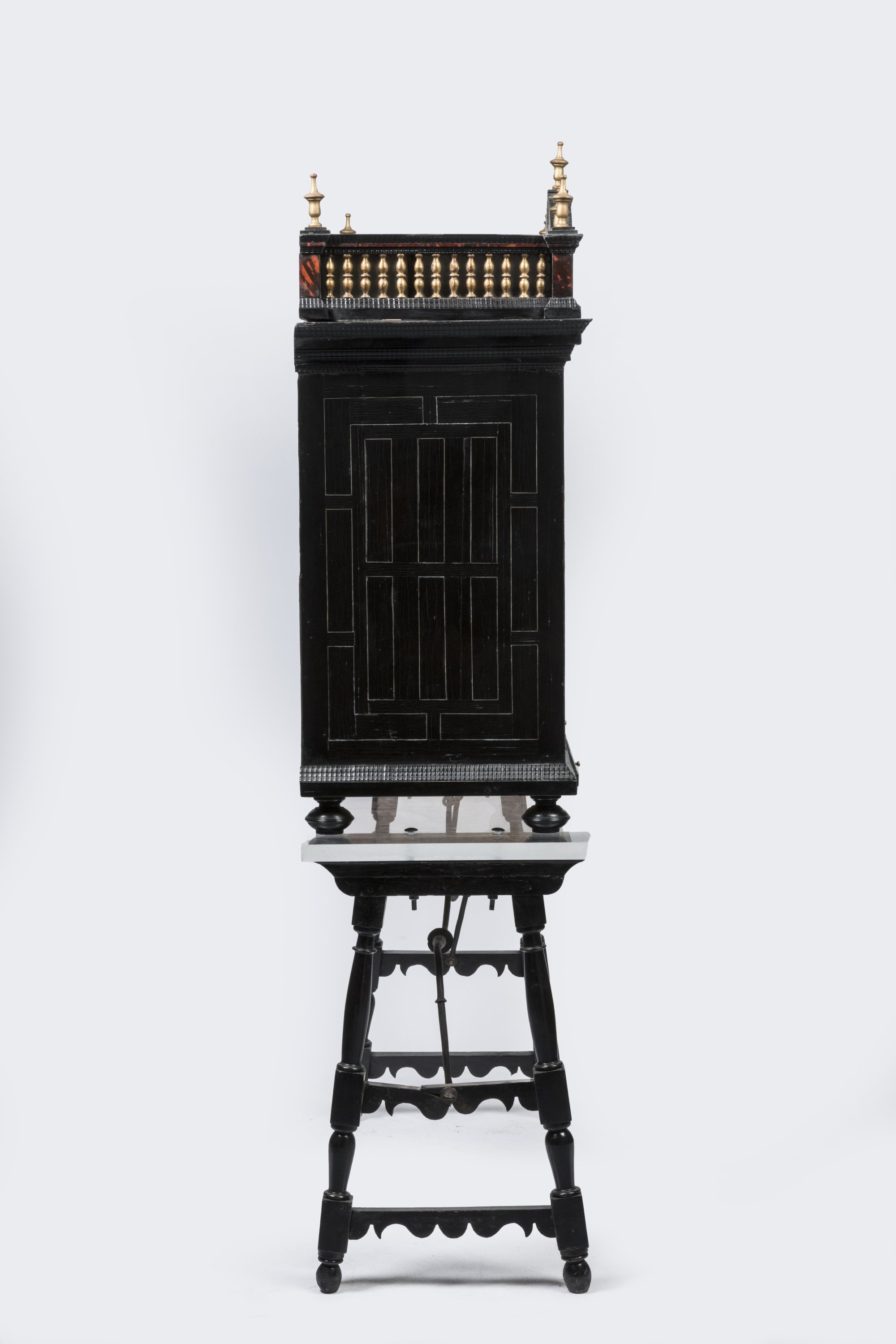 An ormolu-mounted ebony, tortoiseshell, bone, bronze, and giltwood display cabinet with mercury mirrors. On a modern base. Flanders, 17th century.