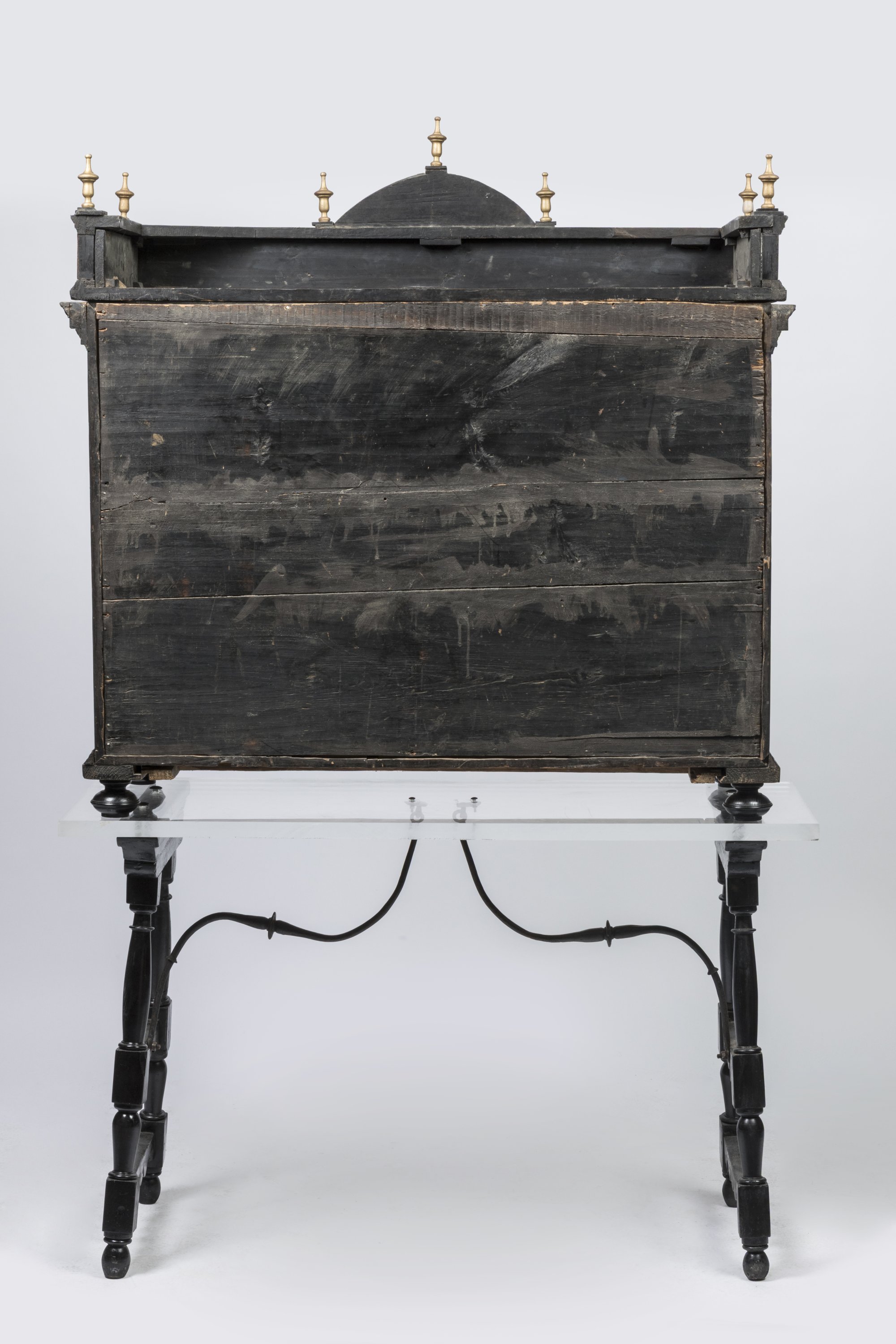ll ouvre en façade par 12 tiroirs encadrant deux vantaux dissimulés derrière trois colonnes torsadées. L'intérieur se compose d'un théâtre aux colonnes et balustrades sur fond de miroirs et pavages de cubes. Deux tirettes sur les côtés dévoilent des scènes de chasse peintes et cachent six tiroirs à secrets. Une tirette en partie basse pour former écritoire. L'ensemble est surmonté d'une corniche à doucine à décor d'une balustrade et de pinacles entourant un fronton en arc de cercle.