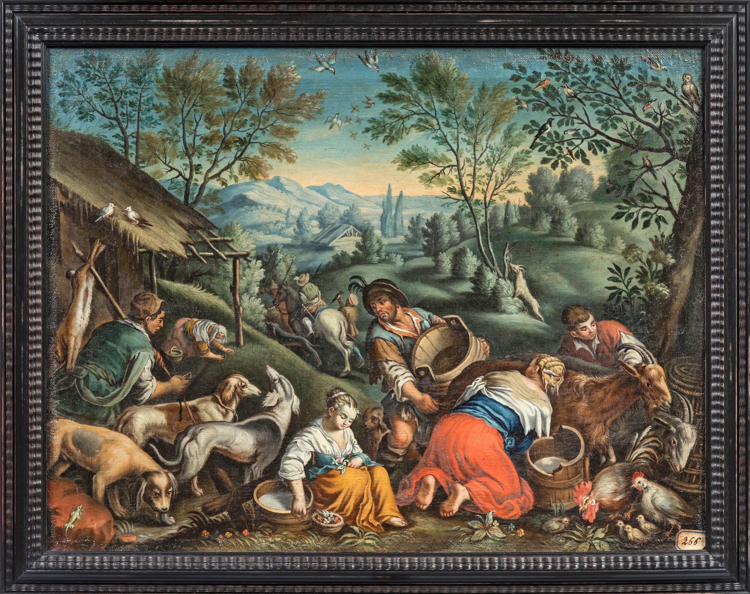 A set of paintings depicting the four seasons after Jacopo Bassano. Oil on original canvas. Flemish School ca. 1700.