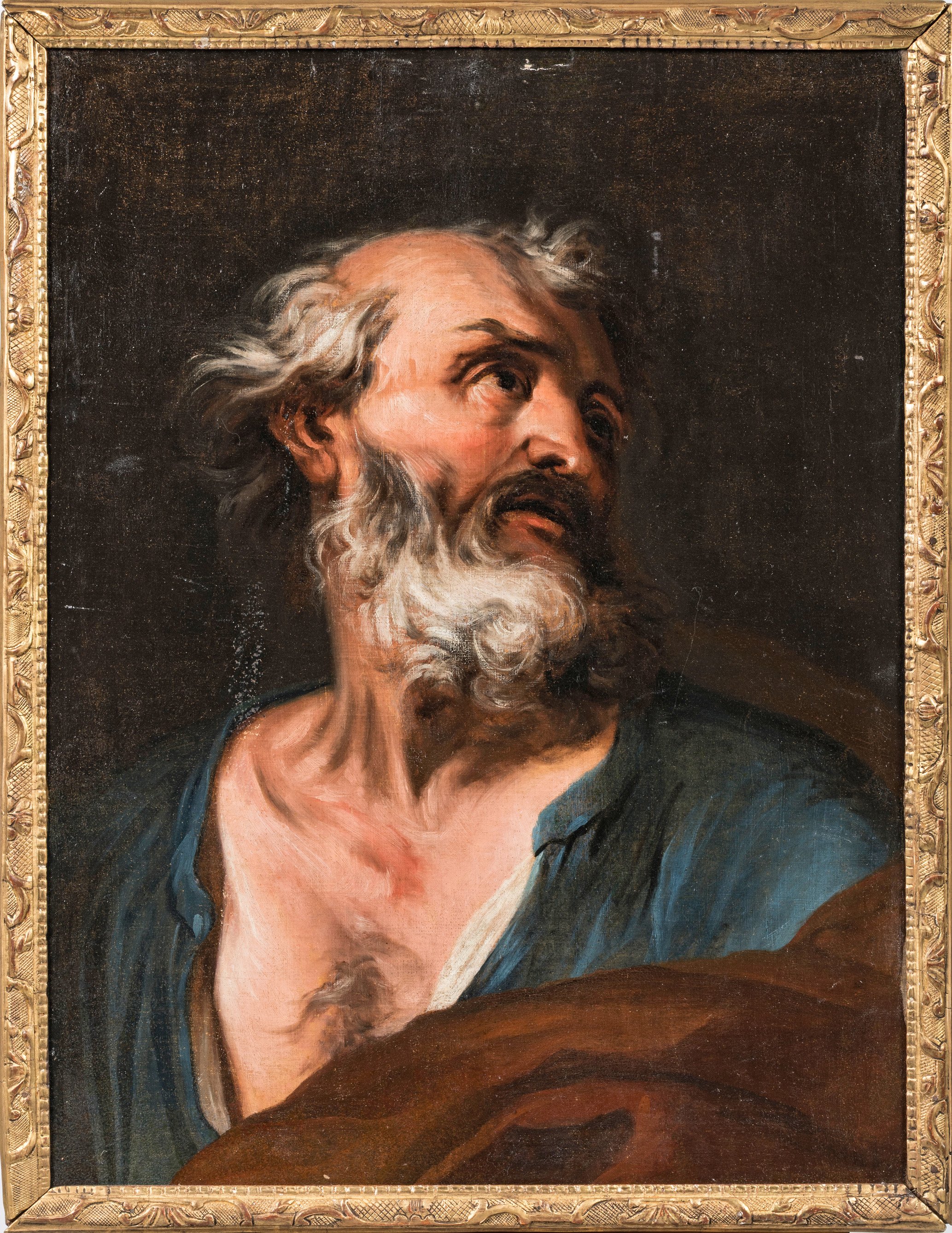 A portrait of Saint Peter. Oil on original canvas in a giltwood frame. Roman School, 18th century.