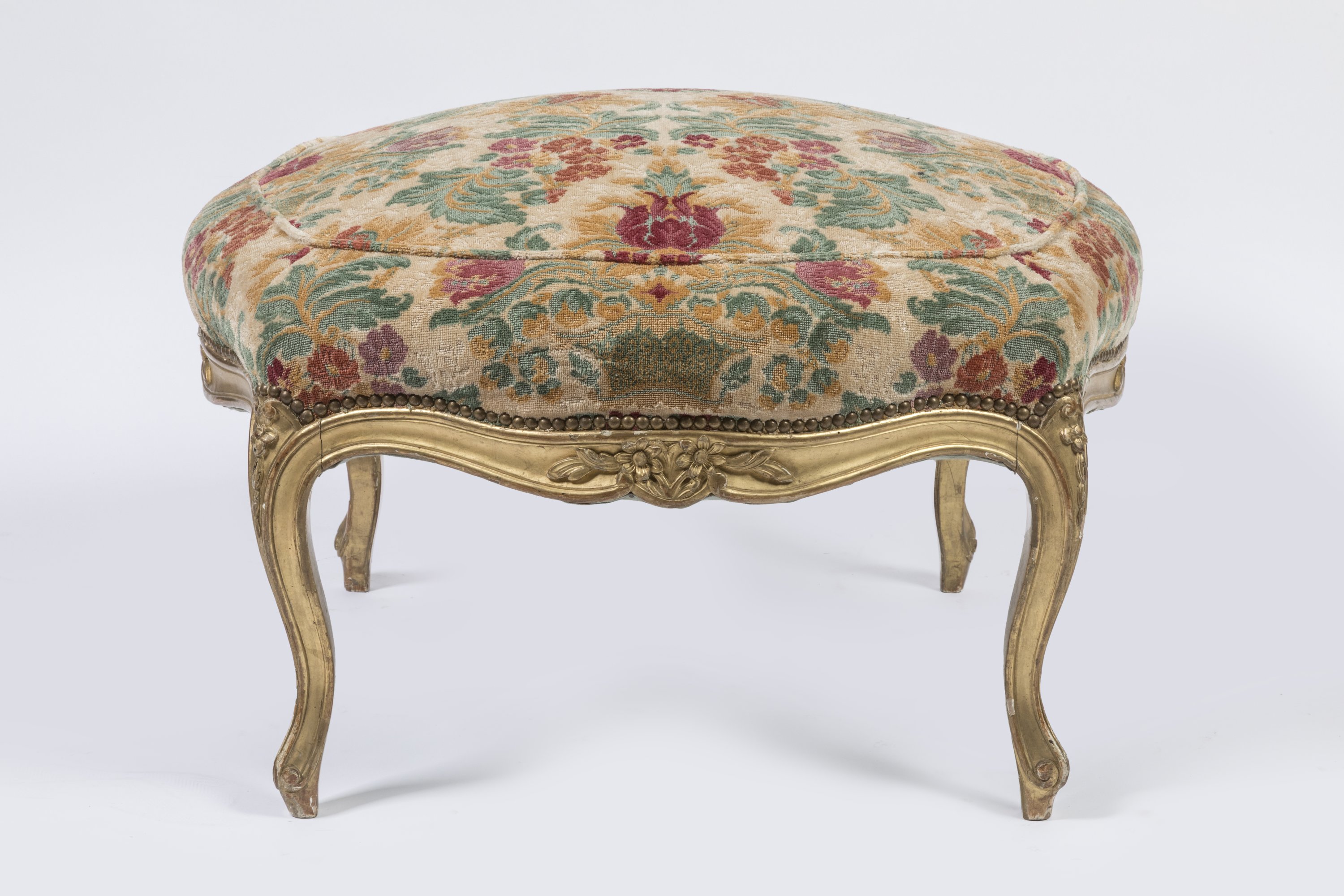 Large round carved and moulded giltwood stool with floral upholstery. Louis XV style, 19th century.