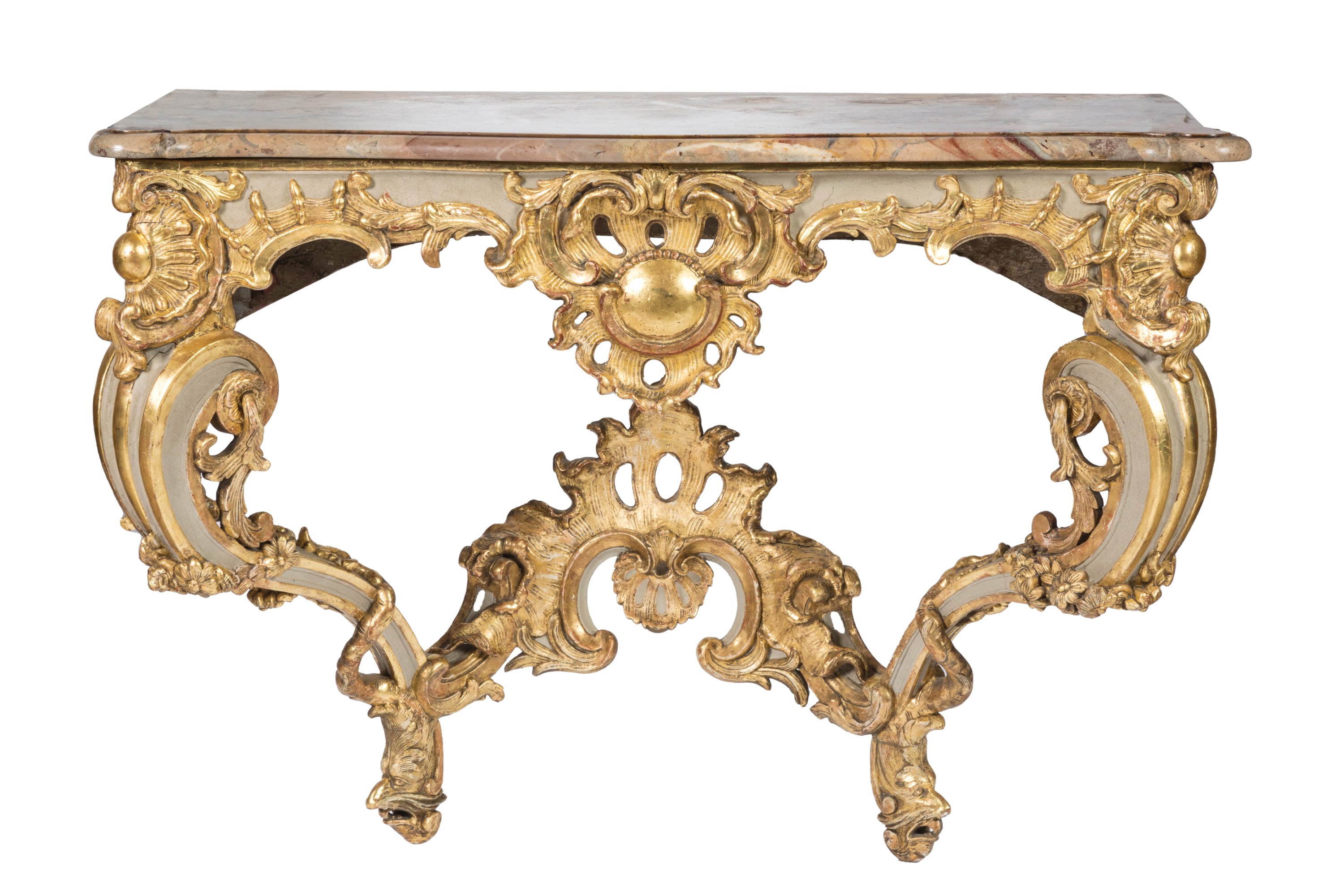 Riche décor ajouré de coquilles, rinceaux, volutes, frises de perles et feuilles d'acanthe, les deux pieds cambrés se rejoignent en une entretoise en forme de coquille dorée et pieds en forme de dauphin.