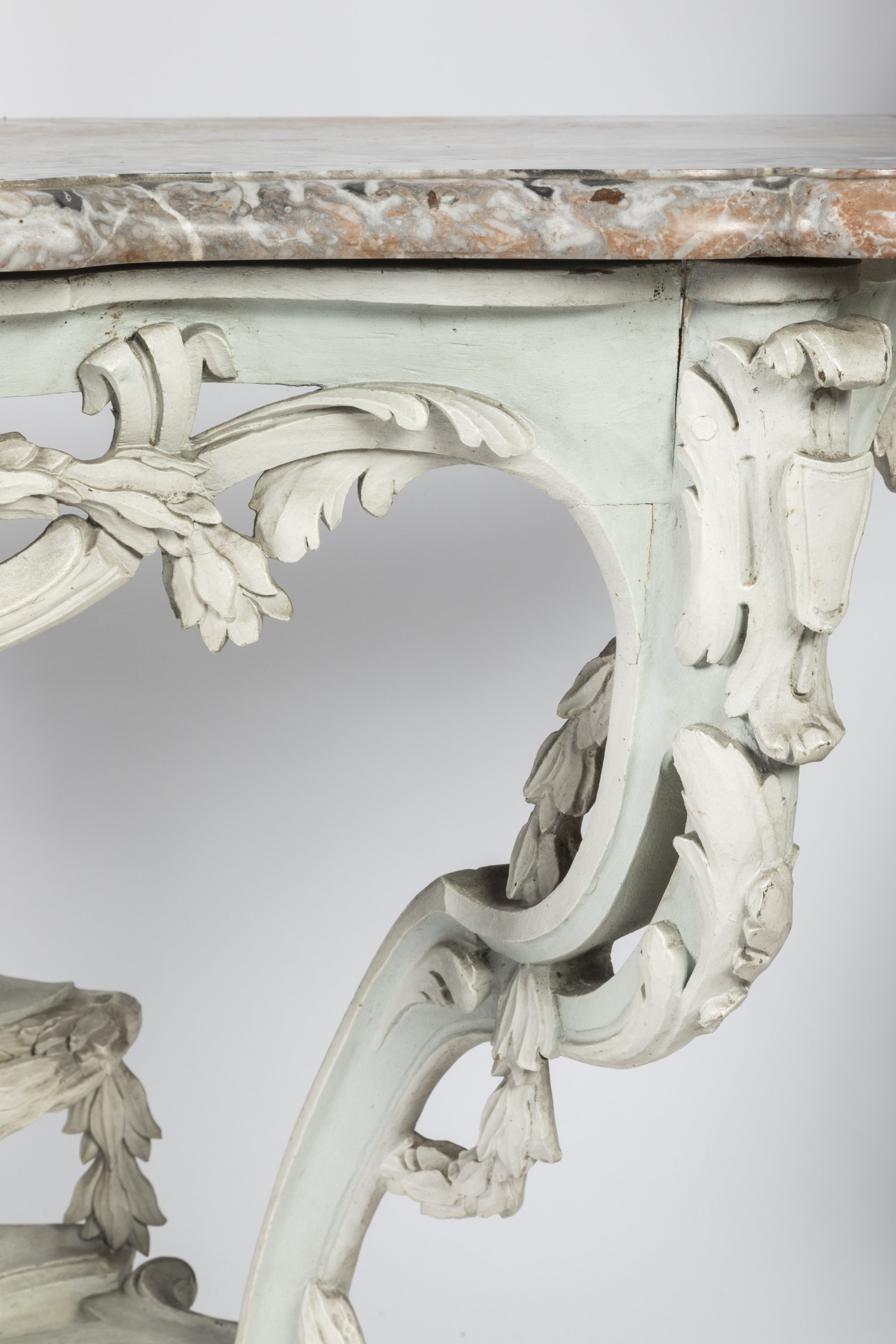 Nos deux consoles formant fausse paire s'inscrivent dans la production du règne de Louis XV et notamment des dessins de l'architecte Pierre Contant d'Ivry. Les enroulements de guirlande sont à rapprocher d’un dessin pour une console de la Salle de Jeu du Palais Royal (in Bill Pallot, "L'art du siège au XVIIIe siècle en France", Paris, Gismondi, 1987, p. 156). Ce type de console à montants ajouré se retrouve parmi les plus importantes collections, à l’instar de celle du financier Jean Pâris de Montmartel comme en témoigne son portrait dessiné par Cochin fils (ibid., reproduit p. 256). Nicolas Heurtault livre quant à lui une console de lambris à Charles-Jean-Baptiste du Tillet vers 1758 pour le château de Villarceaux, où l’on observe « une puissante symétrie ».
