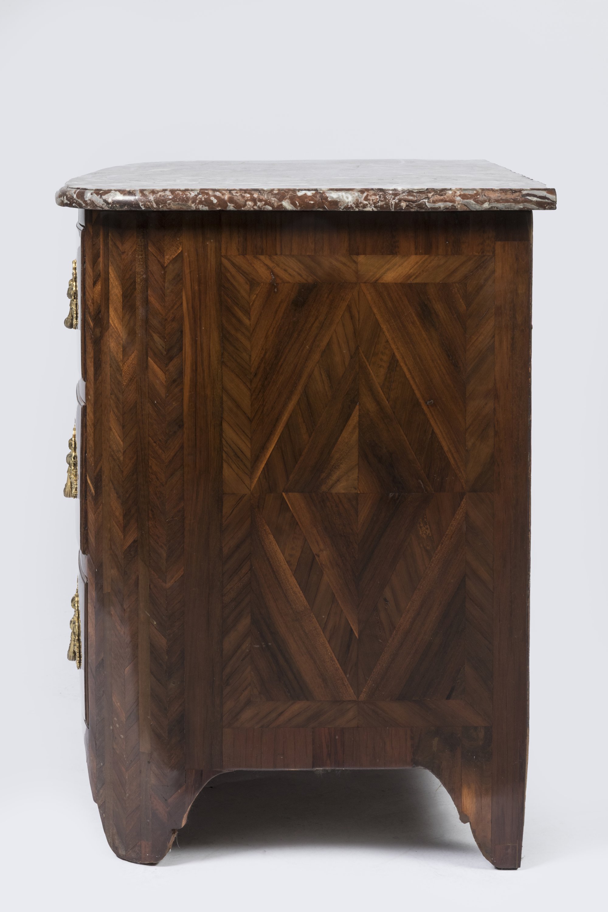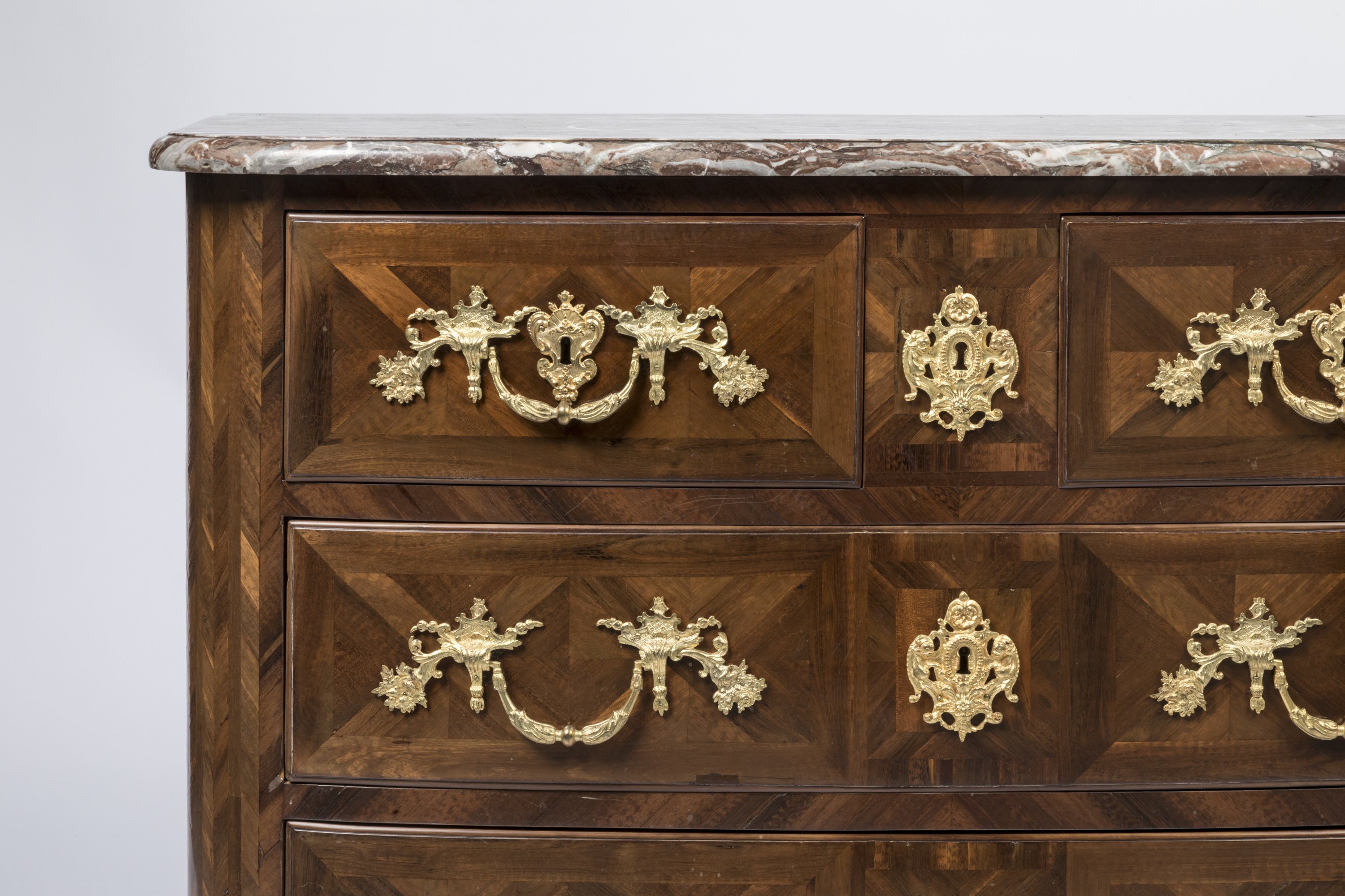A violetwood veneer chest of drawers. Stamped. Louis XIV Period. Lavish ormolu ornaments and red marble top added at a later date.