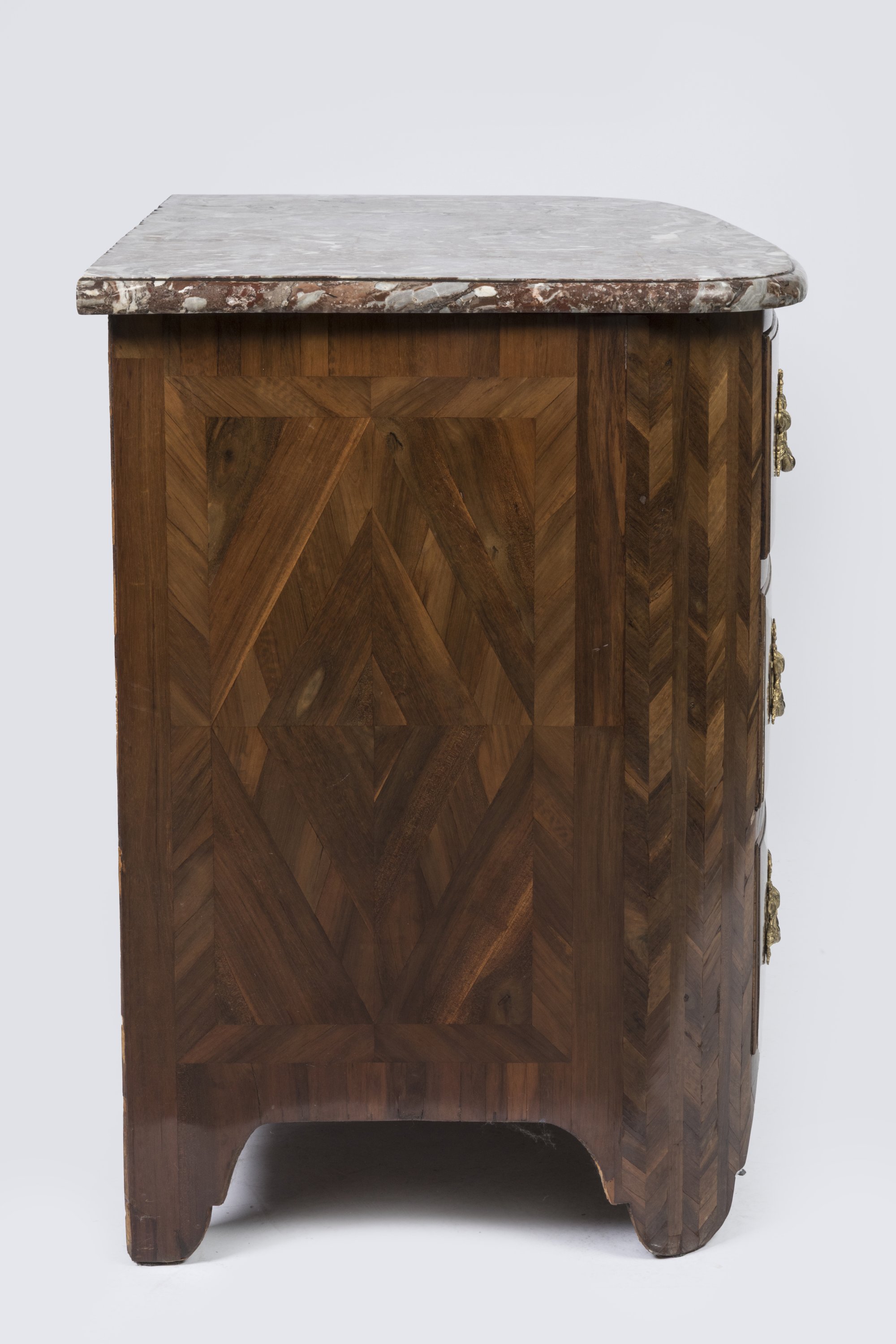 La façade légèrement bombée ouvre par cinq tiroirs sur trois rangs décorés de losanges dans des encadrements. Les montants arrondis présentent des cannelures simulées et les côtés plaqués de losange.