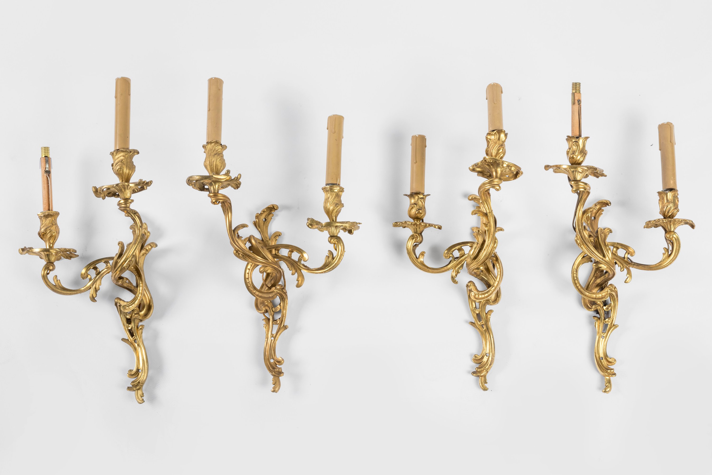 Two pairs of asymmetrical chiseled ormolu wall sconces. Louis XV style.