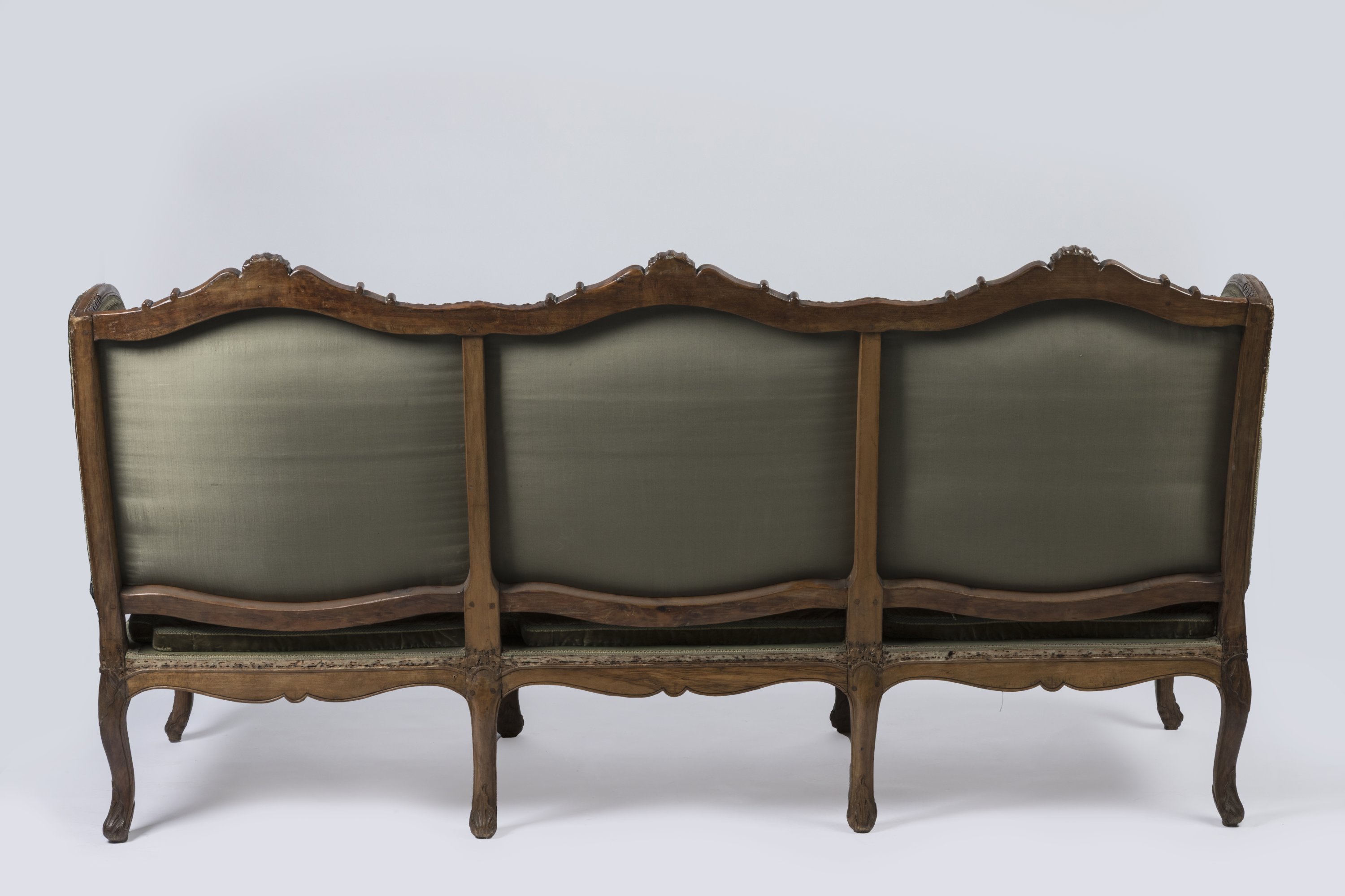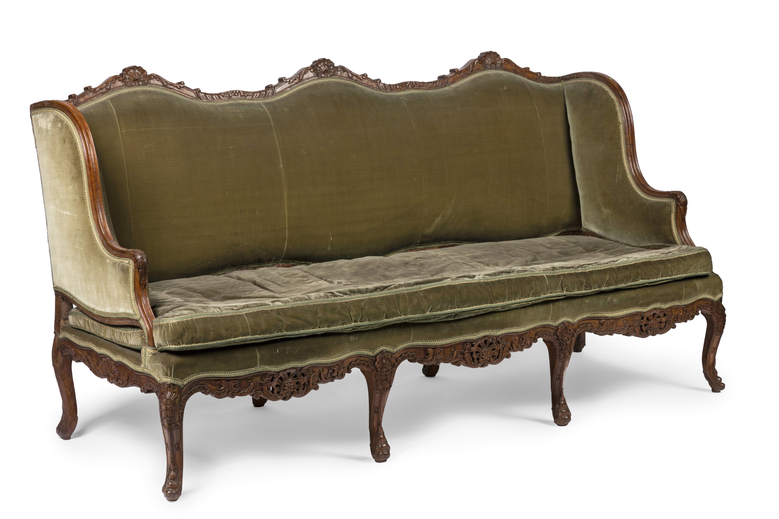A moulded and carved walnut eared sofa upholstered in green velvet. Louis XV Period, presumably made in Lyon.