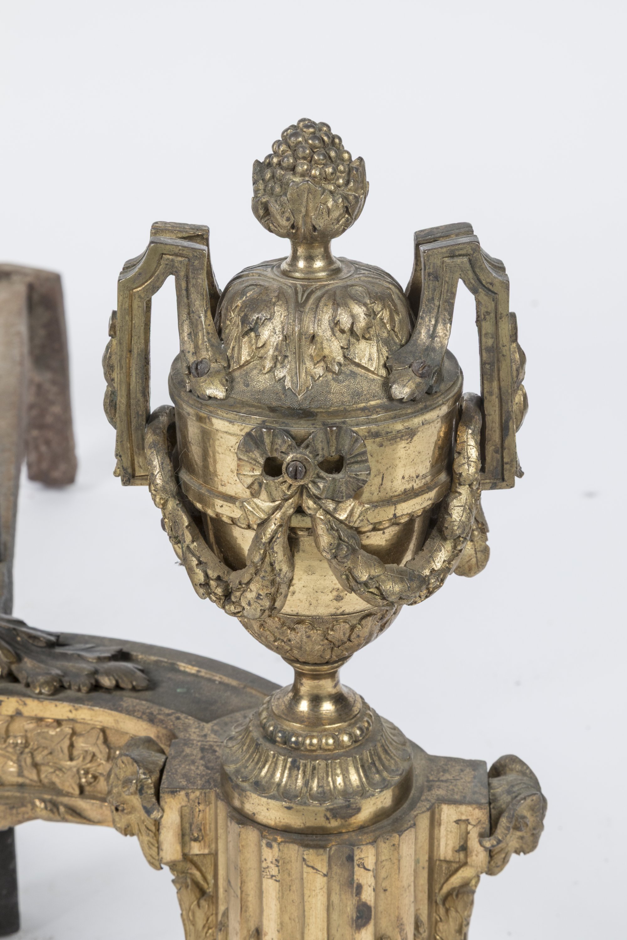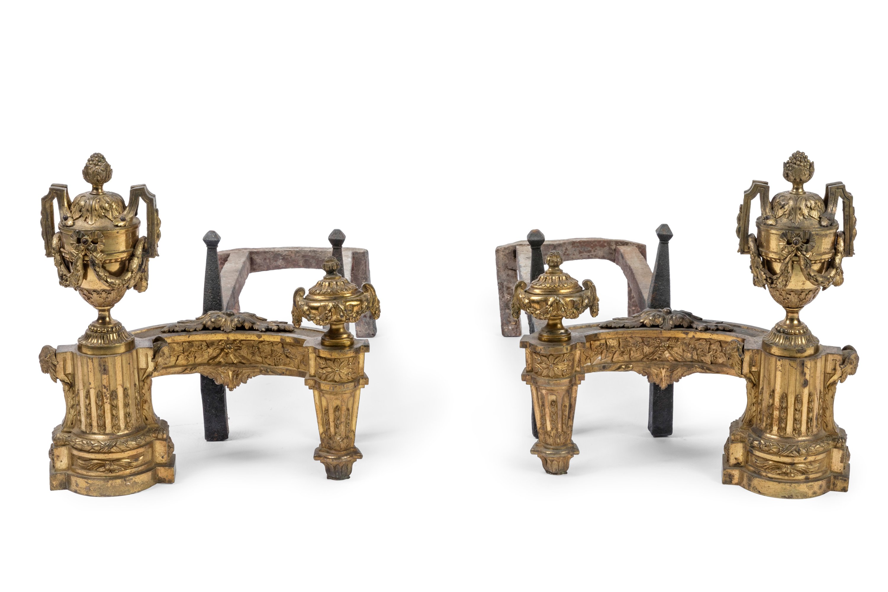 A pair of gilded and chiseled bronze andirons. Louis XVI style, 19th century.