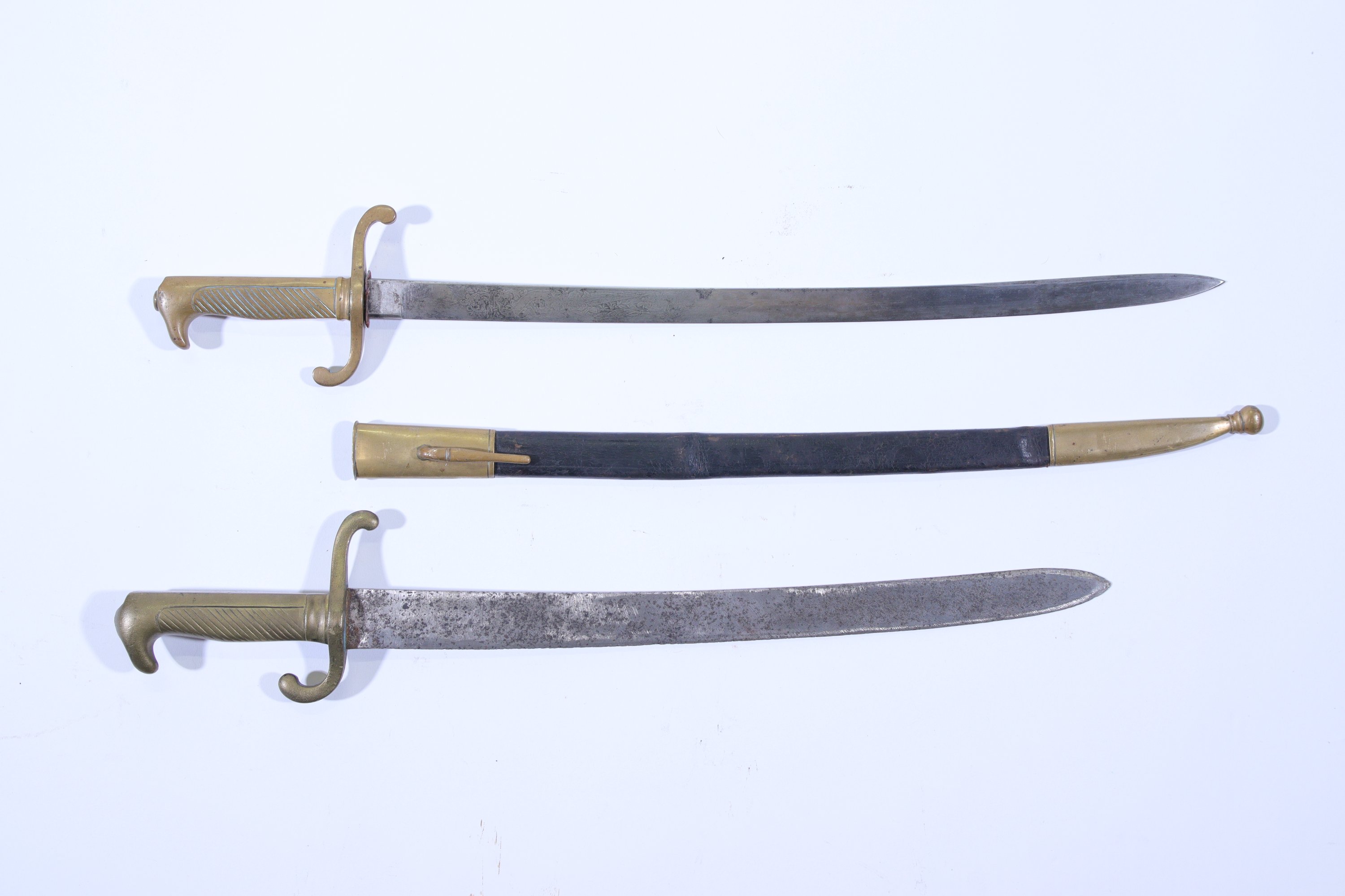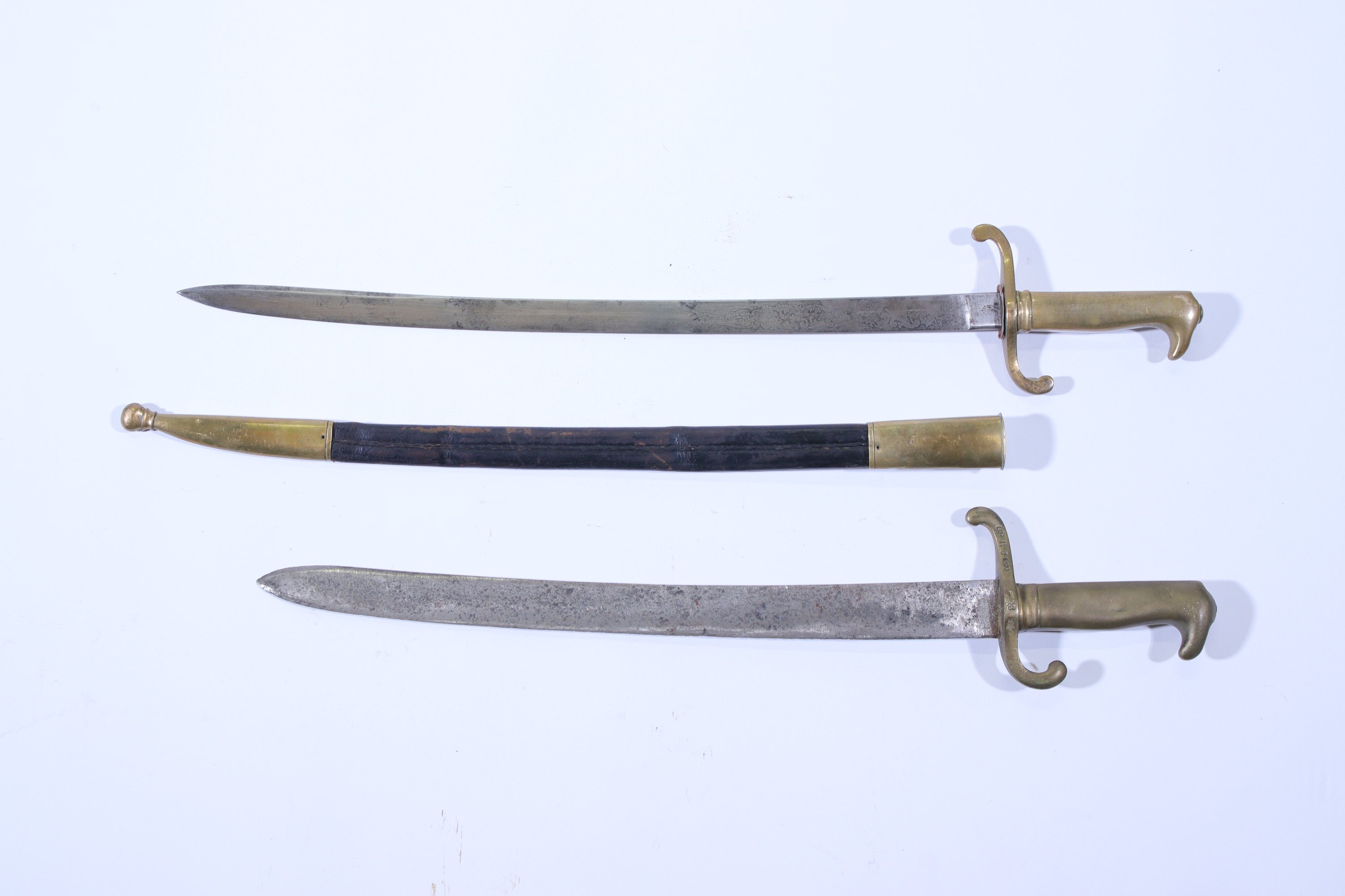 - Dague d’artilleur. Monture en bronze, fine lame de Mohr & Speyer gravée de rinceaux feuillagés à la moitié, fourreaux en cuir à garnitures en laiton.