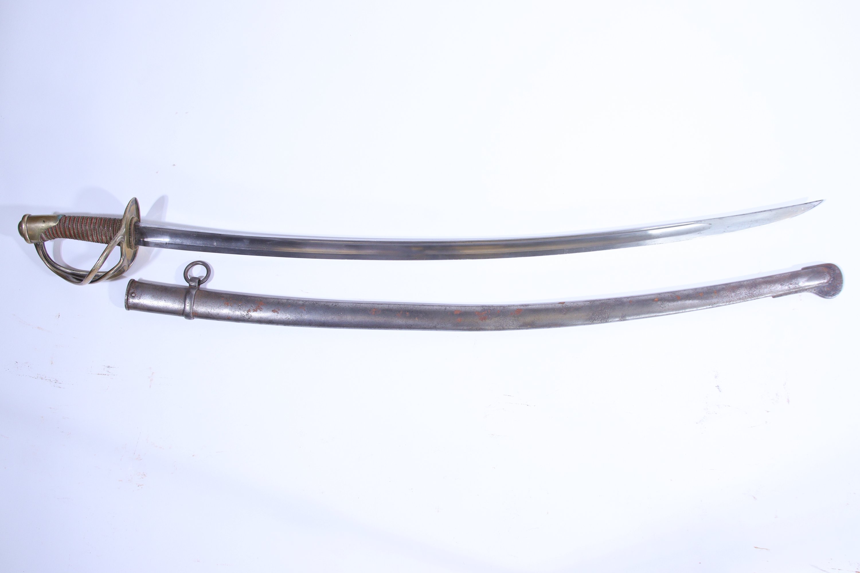 Poignée en cuir brun avec filigrane. Lame de Châtellerault datée 1877. Fourreau allégé à un bracelet au matricule de la garde.