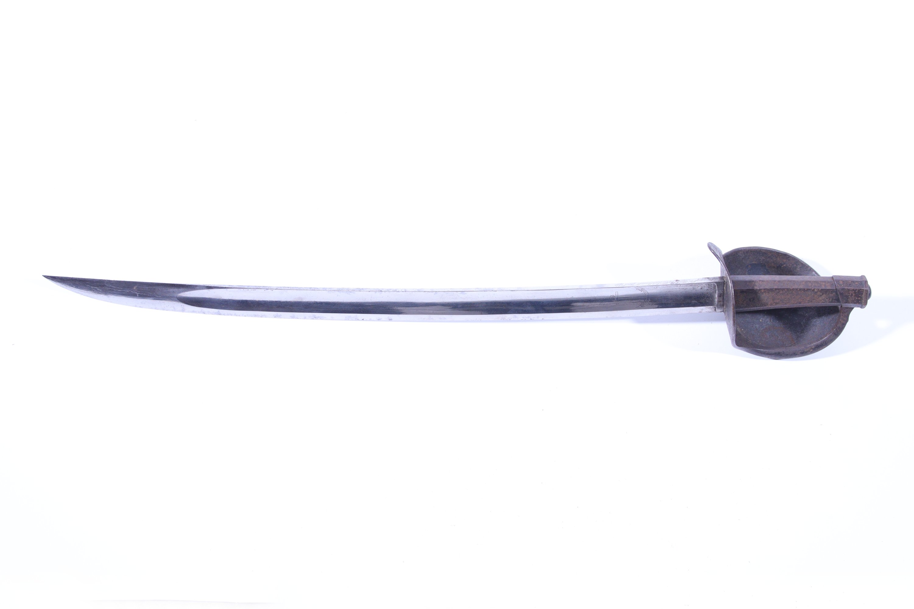 Poignée à pans et monture en fer (restes de peinture), garde à coquille. Quillon poinçonné. Lame courbe à dos plat de Châtellerault datée « Août 1841 », pans creux gravés d’ancres.