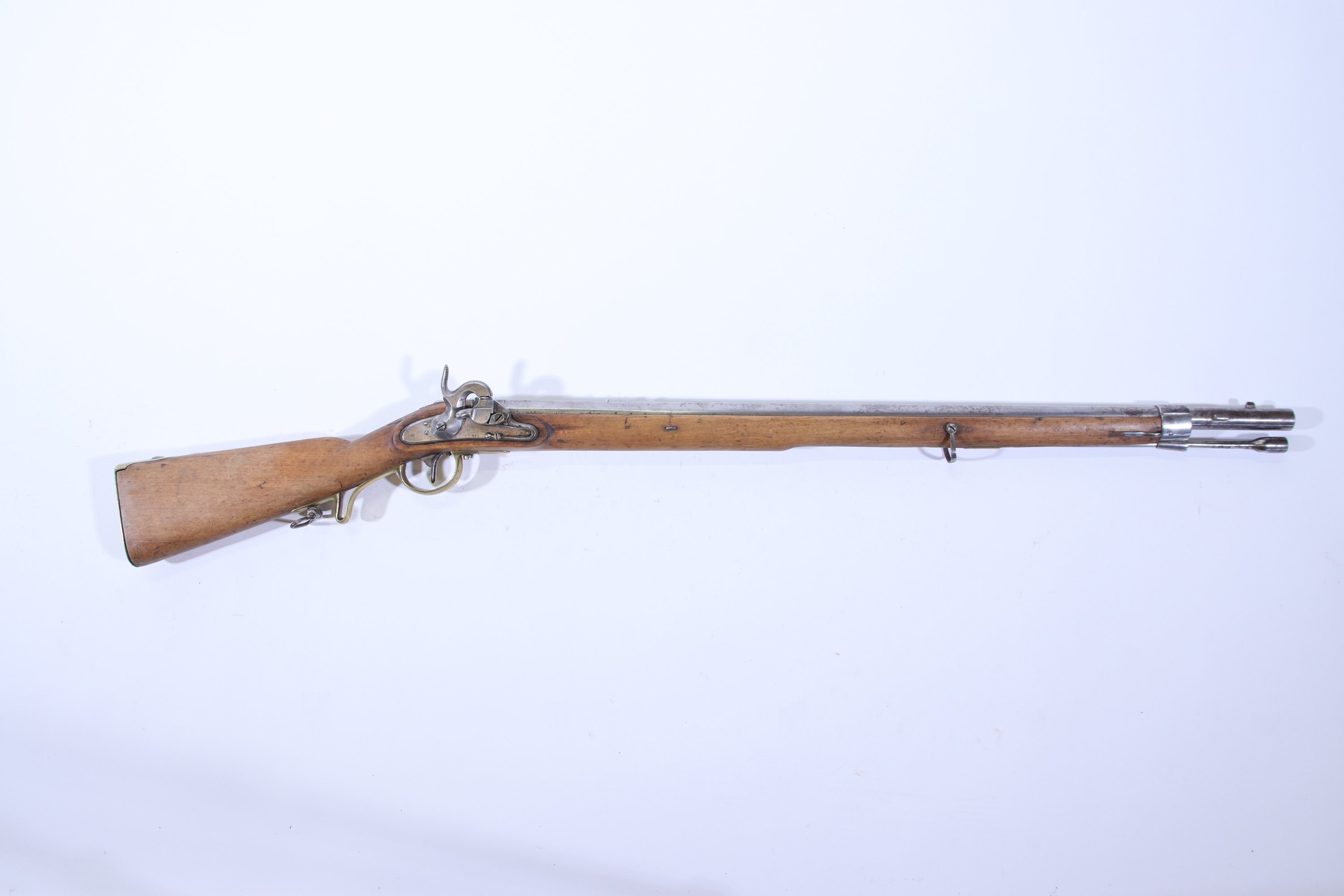 Canon rond, rayé, à pans au tonnerre, avec hausse (absente), poinçonné FERD FRUWIRTH ». Platine datée « 851 » poinçonnée à l’aigle. Garnitures en fer et laiton. Baguette en fer.