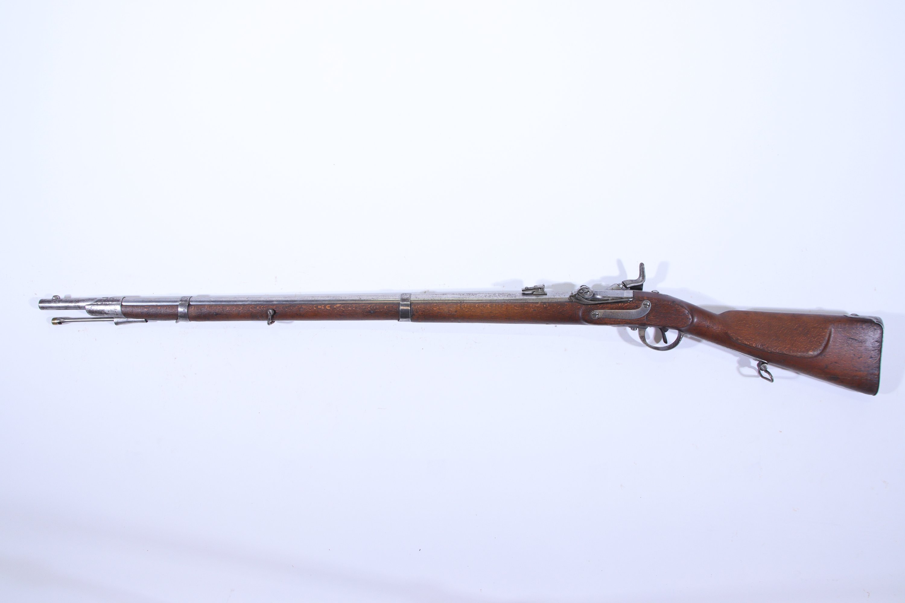 Platine datée « 860 » et poinçon à l’aigle. Chien à corps rond. Garnitures en fer poinçonné S. Crosse à joue en noyer. Baguette en fer.