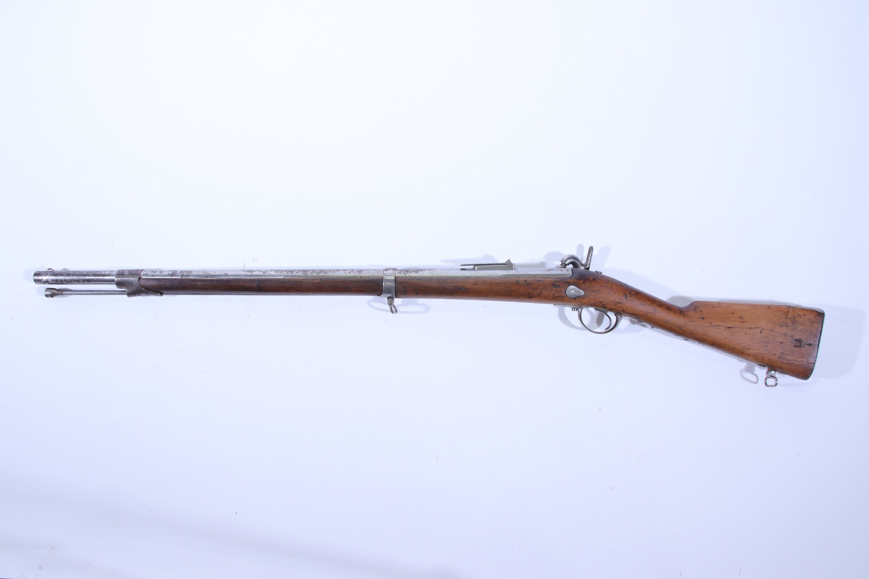 Platine « Mre Nle de Mutzig ». Garnitures en fer. Plaque de couche marquée « C » et « 6 ». Baguette à grosse tête. Crosse en noyer avec enture de 20 cm à l’avant du fût.