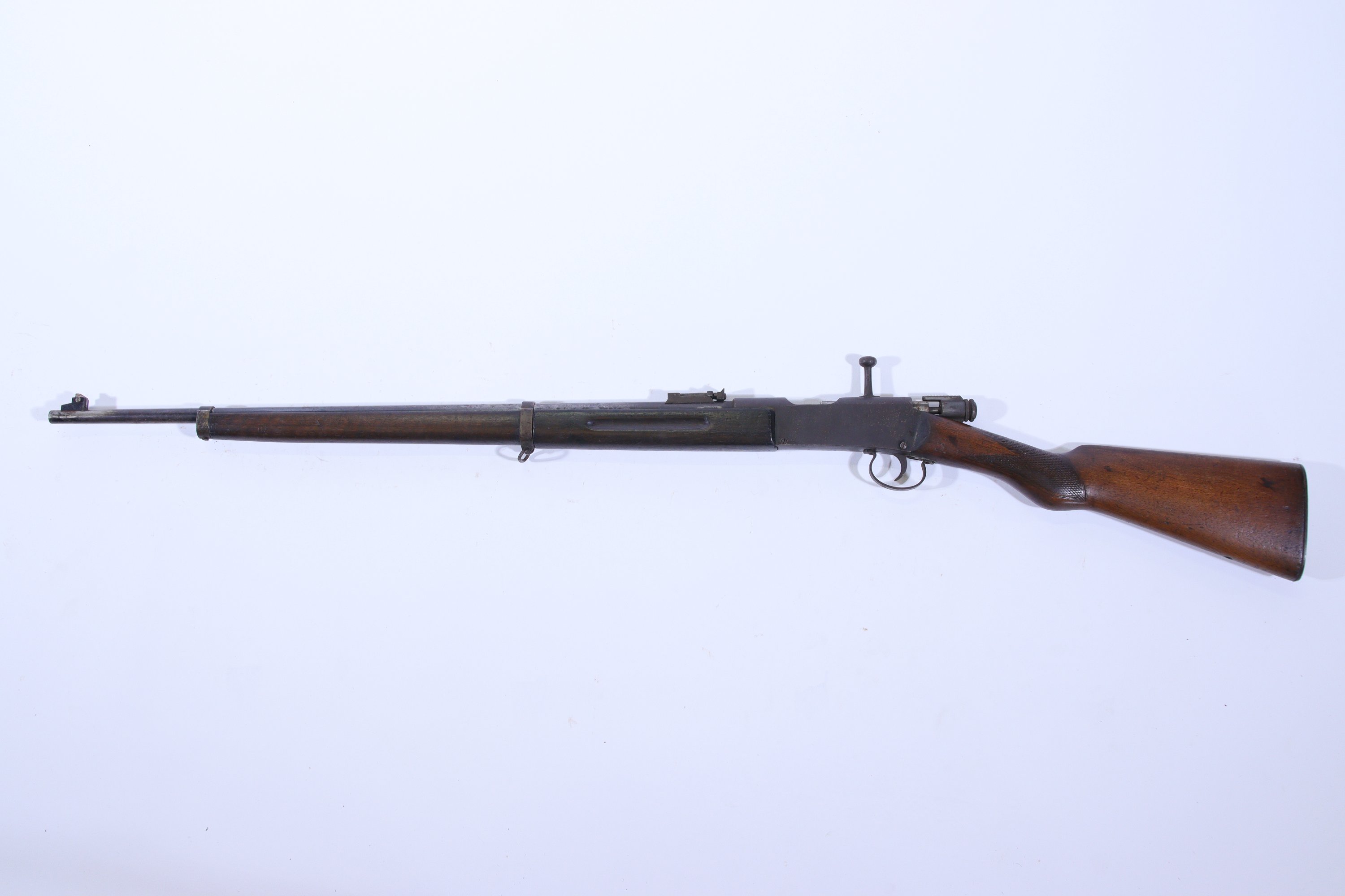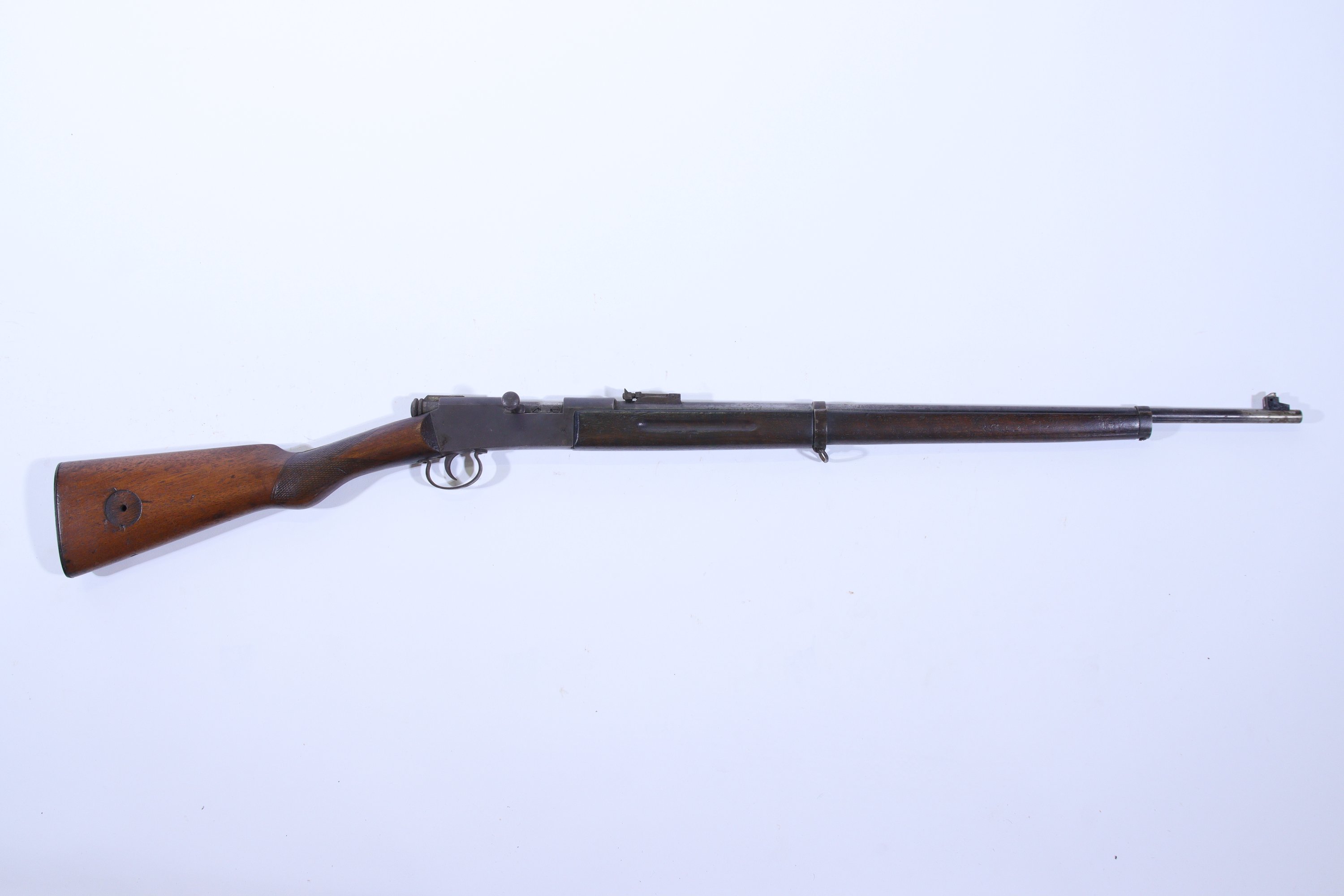 Canon rond avec hausse. Crosse demi-pistolet en partie quadrillée, avec pastille manquante.