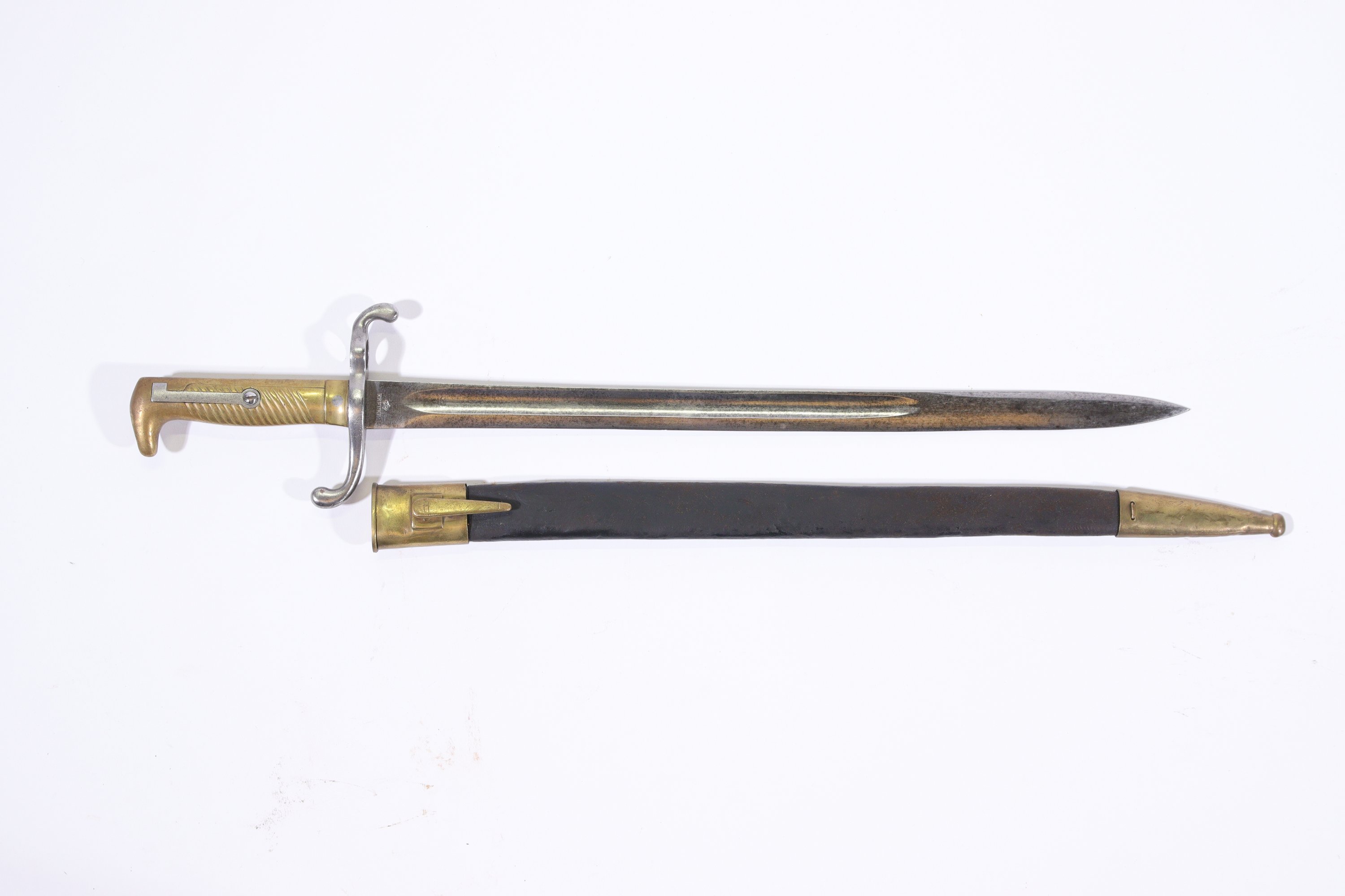 Poignée en laiton, lame signée Weyersberg, fourreau en cuir noir à deux garnitures en laiton.