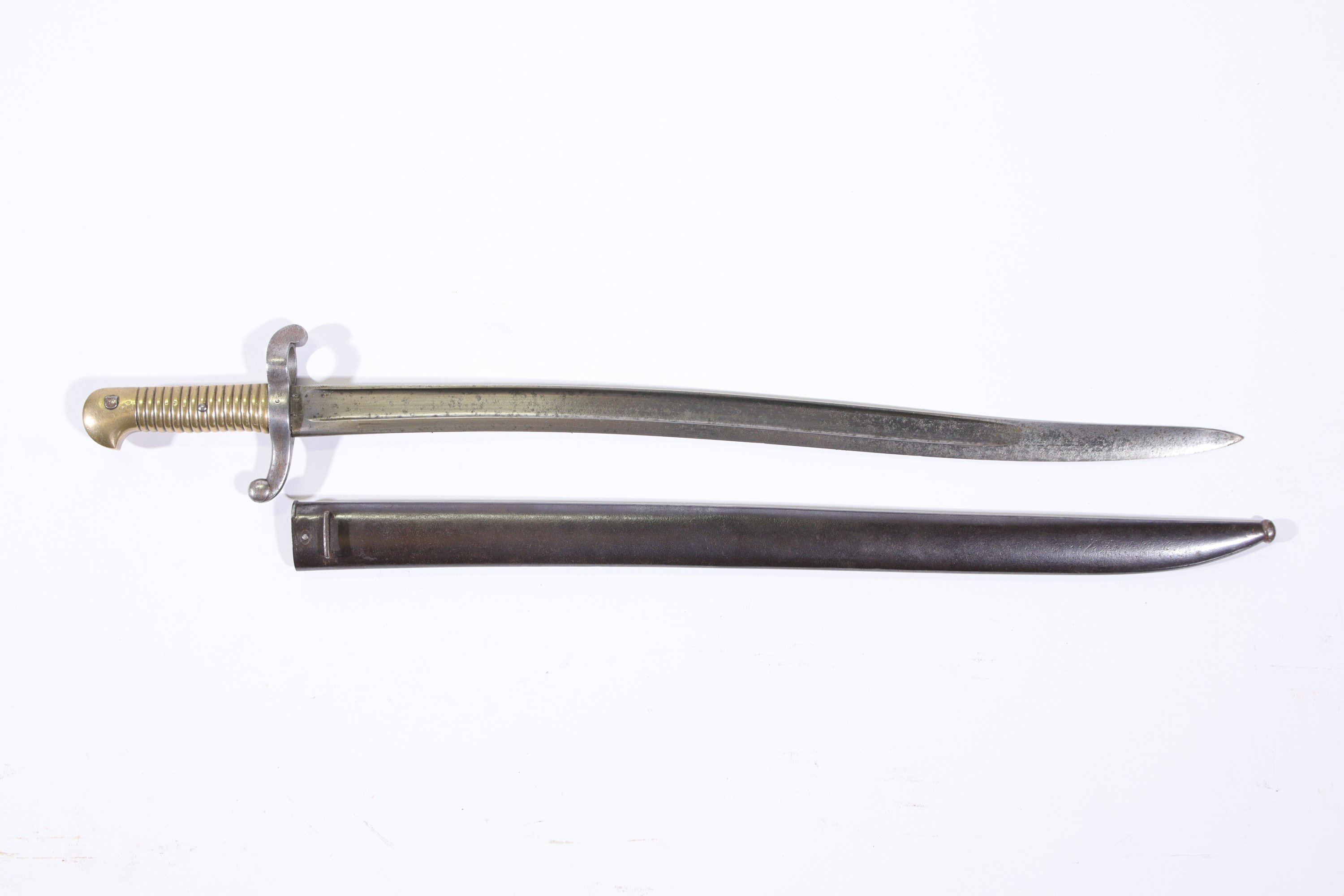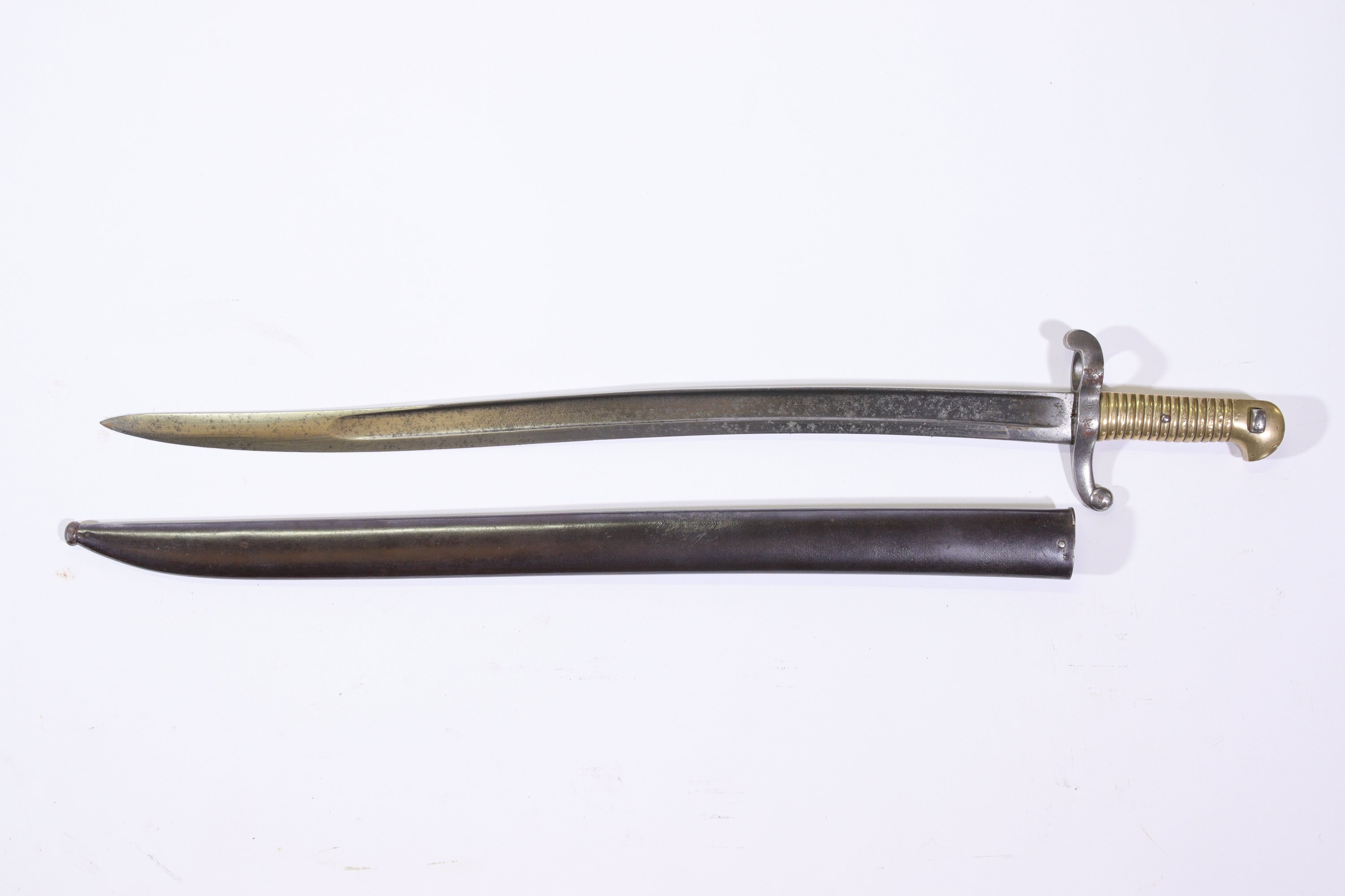Poignée en bronze, croisière poinçonnée, bouton poussoir carré, lame de Châtellerault datée janvier 1866, fourreau bronzé.