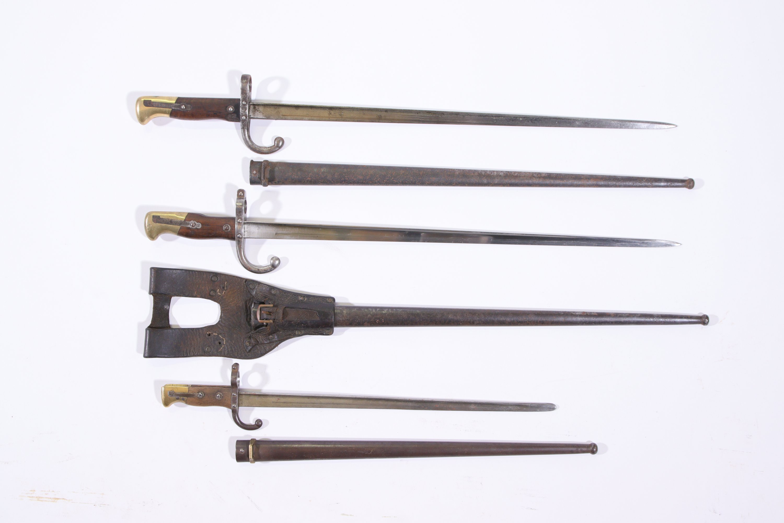 - Une baïonnette Gras, lame marquée « Usine de Steyr » 1877, fourreau bronzé, gousset en cuir. B.E.