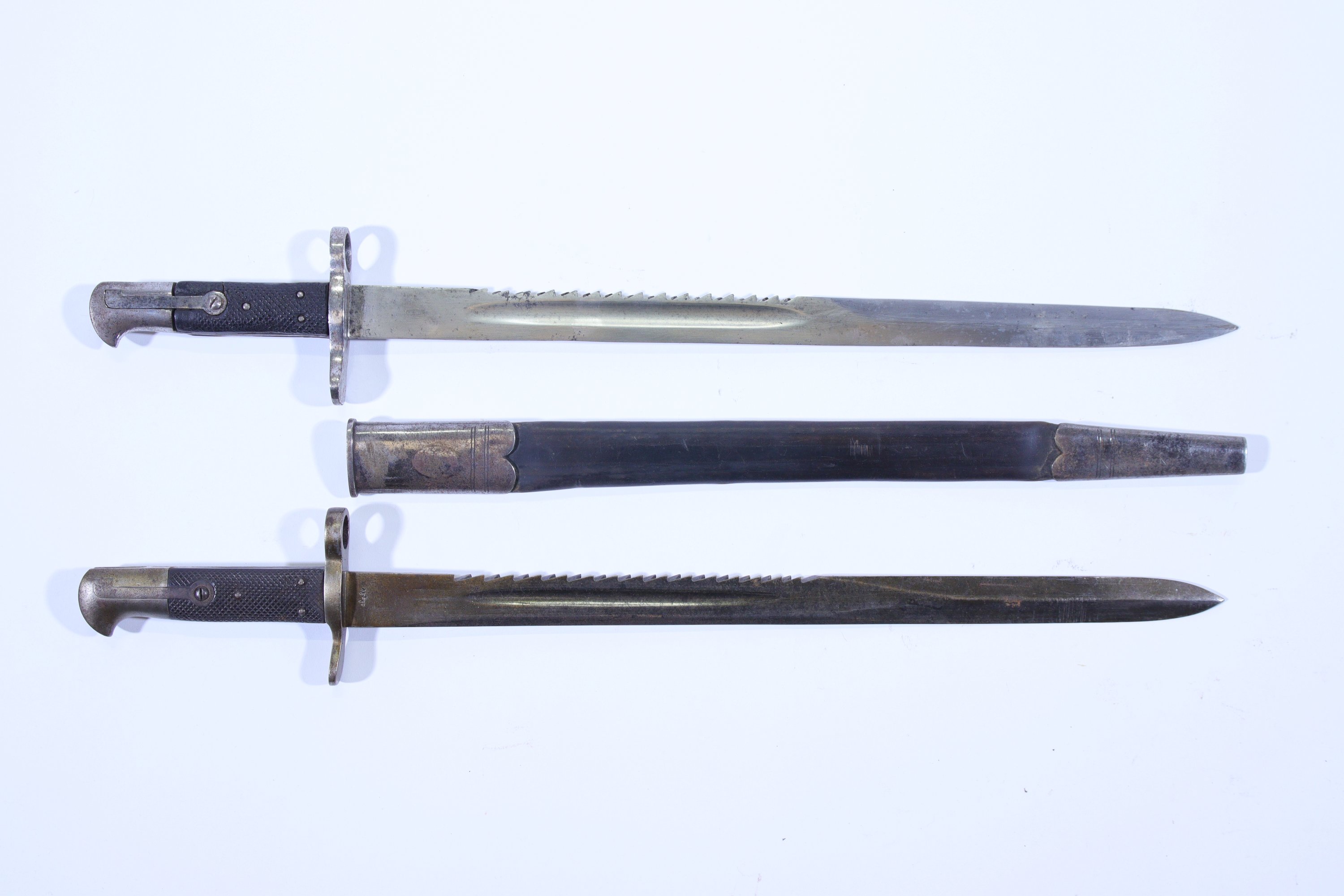 Lames à dos scie, une avec fourreau en cuir et deux garnitures en fer.