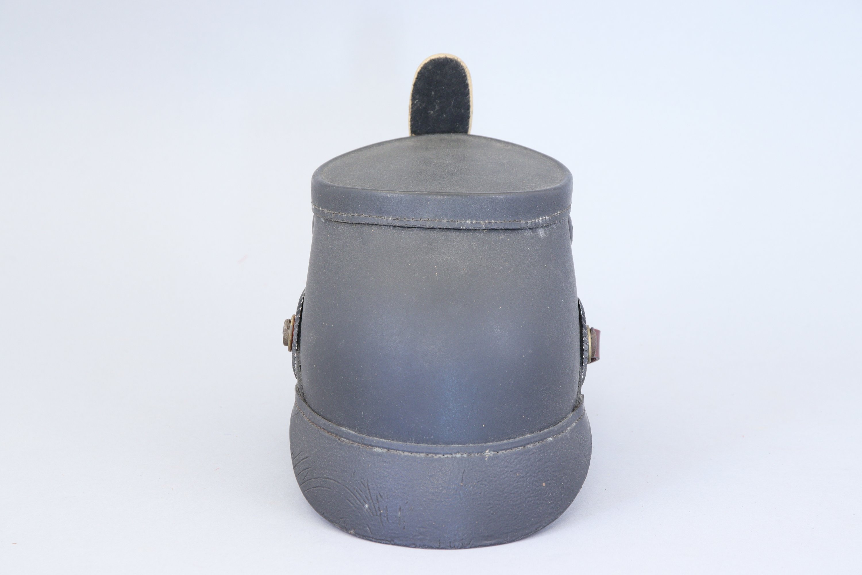 En cuir, plaque à l’aigle peinte en grise, cocardes et jugulaires postérieures.
