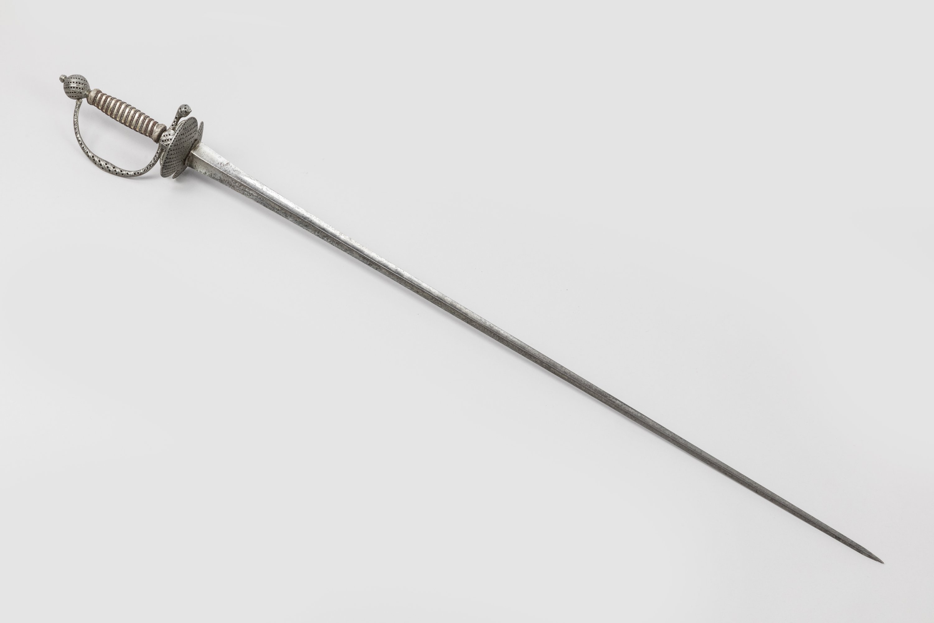 Monture en fer ciselé repercé. Garde à une branche, pas d’âne et coquille. Fusée filigranée de fer et lamée de cuivre. Lame triangulaire.