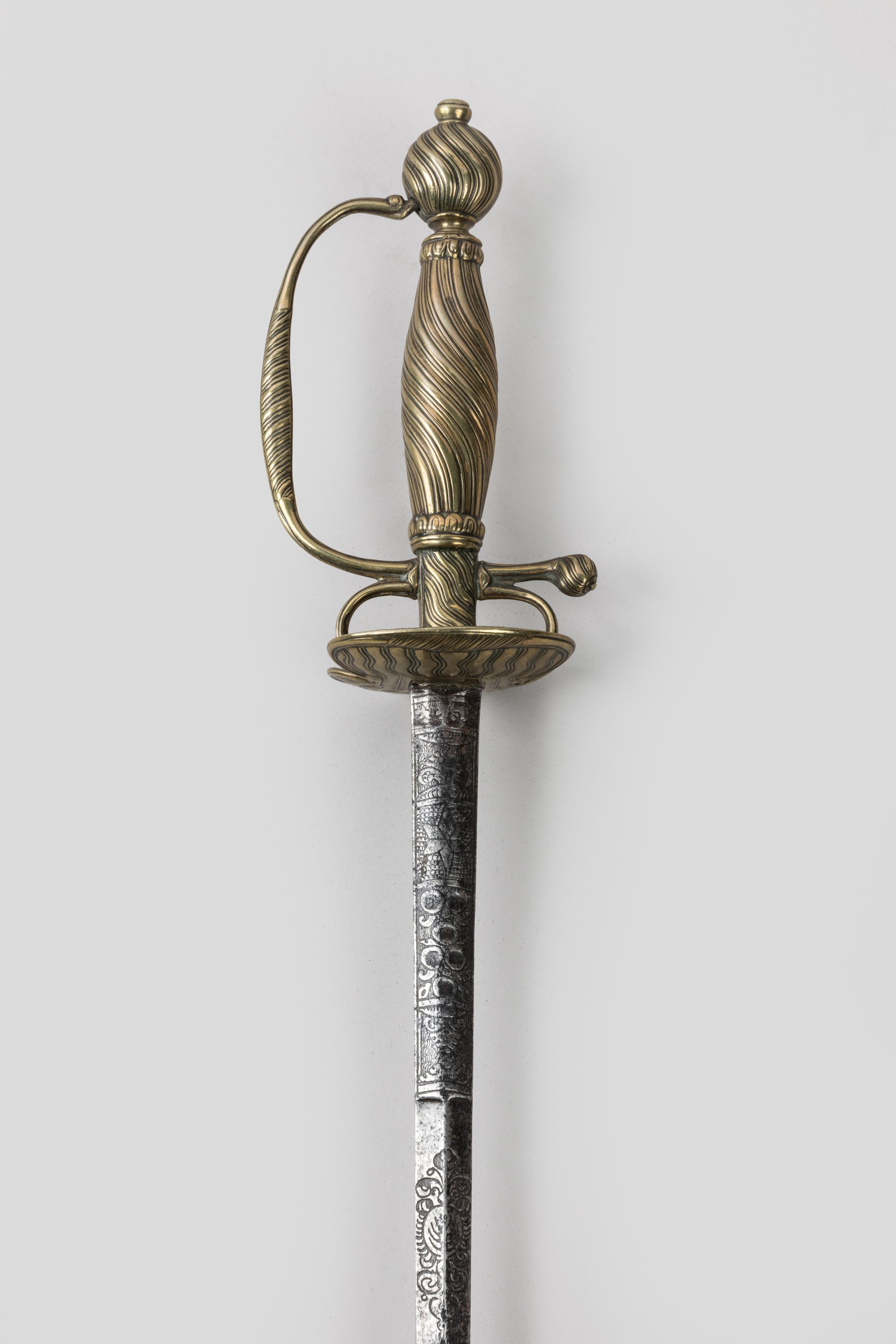 Monture en laiton ciselé. Pommeau rond, fusée, branche de garde, pas d’âne, coquille à décor rainuré. Lame arrondie au talon, gravée au tiers et à arête médiane.