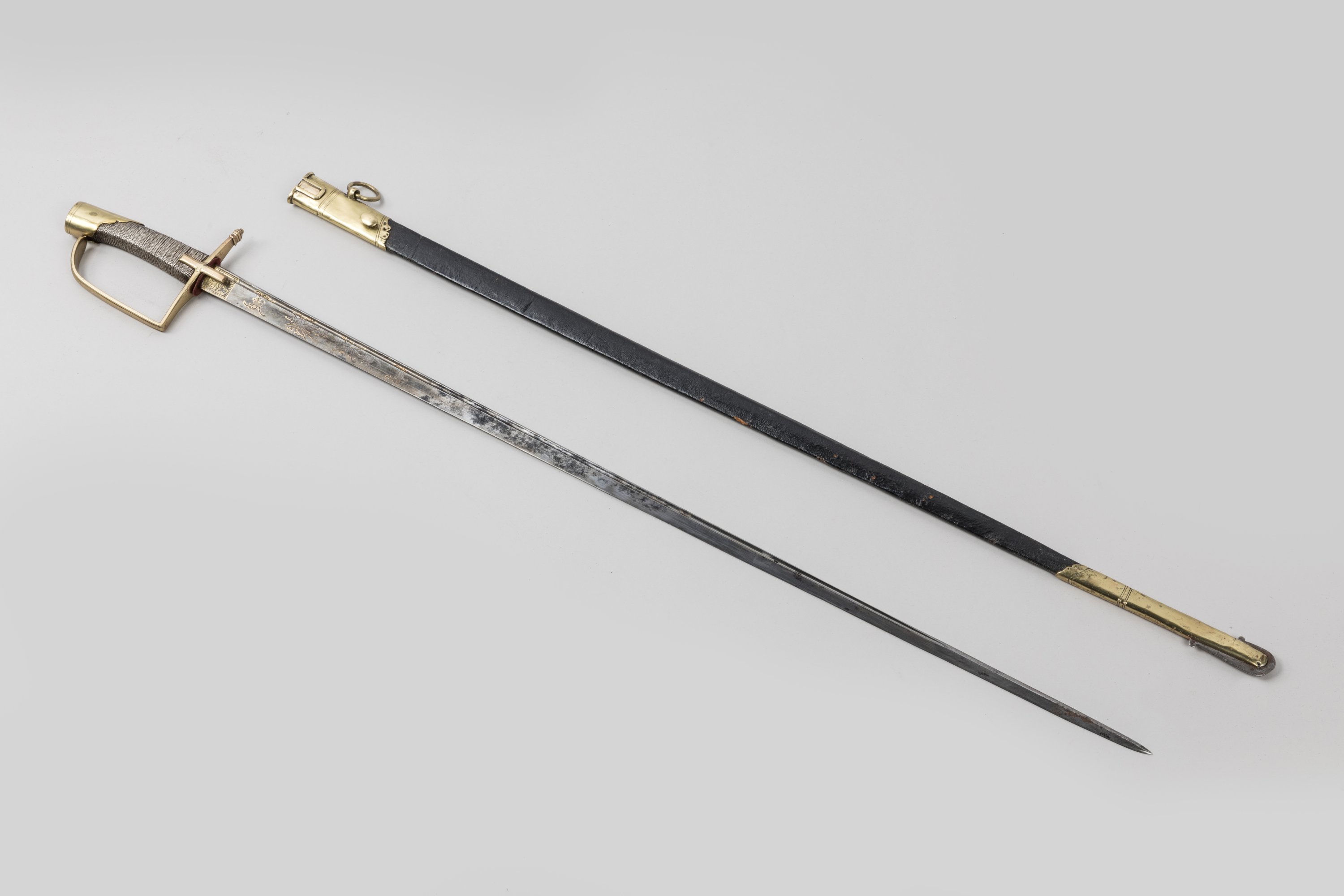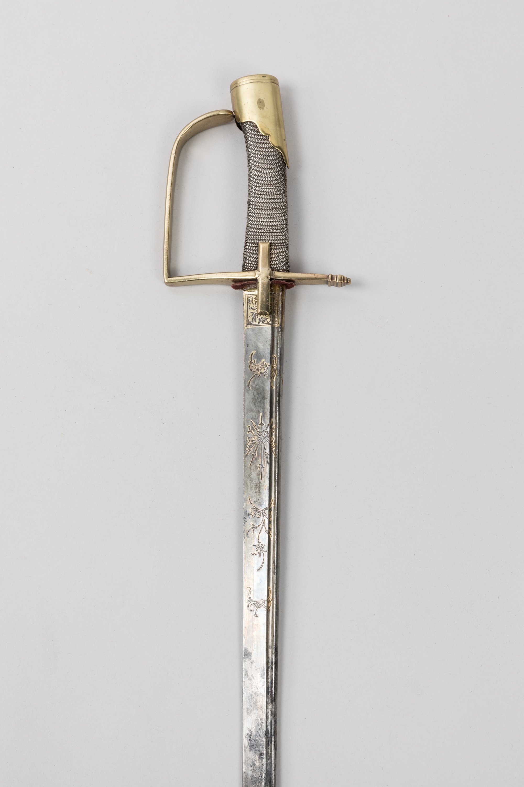 Fine lame droite à dos arrondi, gouttière et pans creux, gravée au tiers de trophées d’armes et rinceaux, sur restes de fond d’or. Fourreau en cuir à deux garnitures en laiton découpé, décoré au trait.