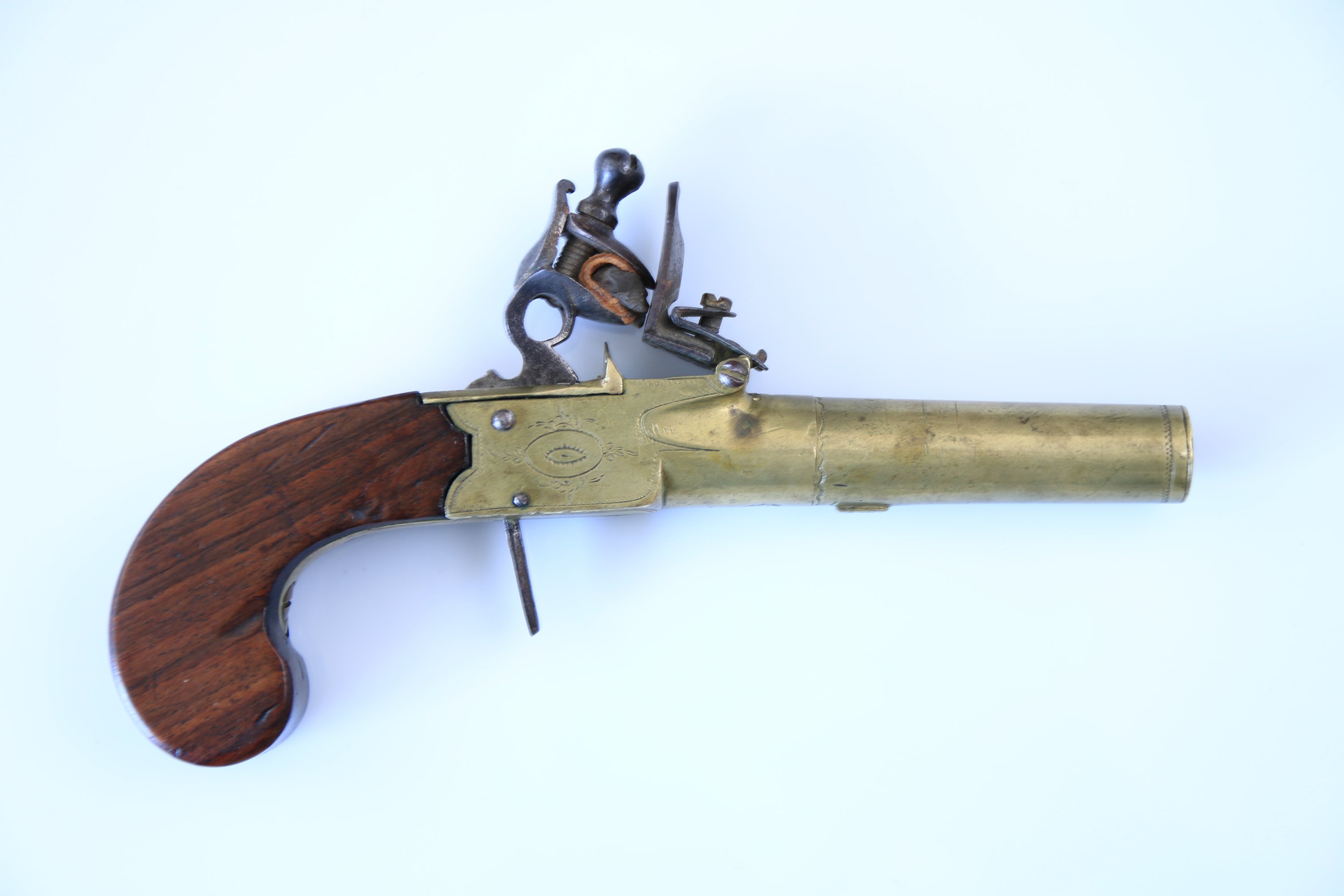 Canon rond à balle forcée et coffre signé « Molineux », en bronze. Poinçons d’épreuve anglais. Détente rentrante. Crosse en noyer.