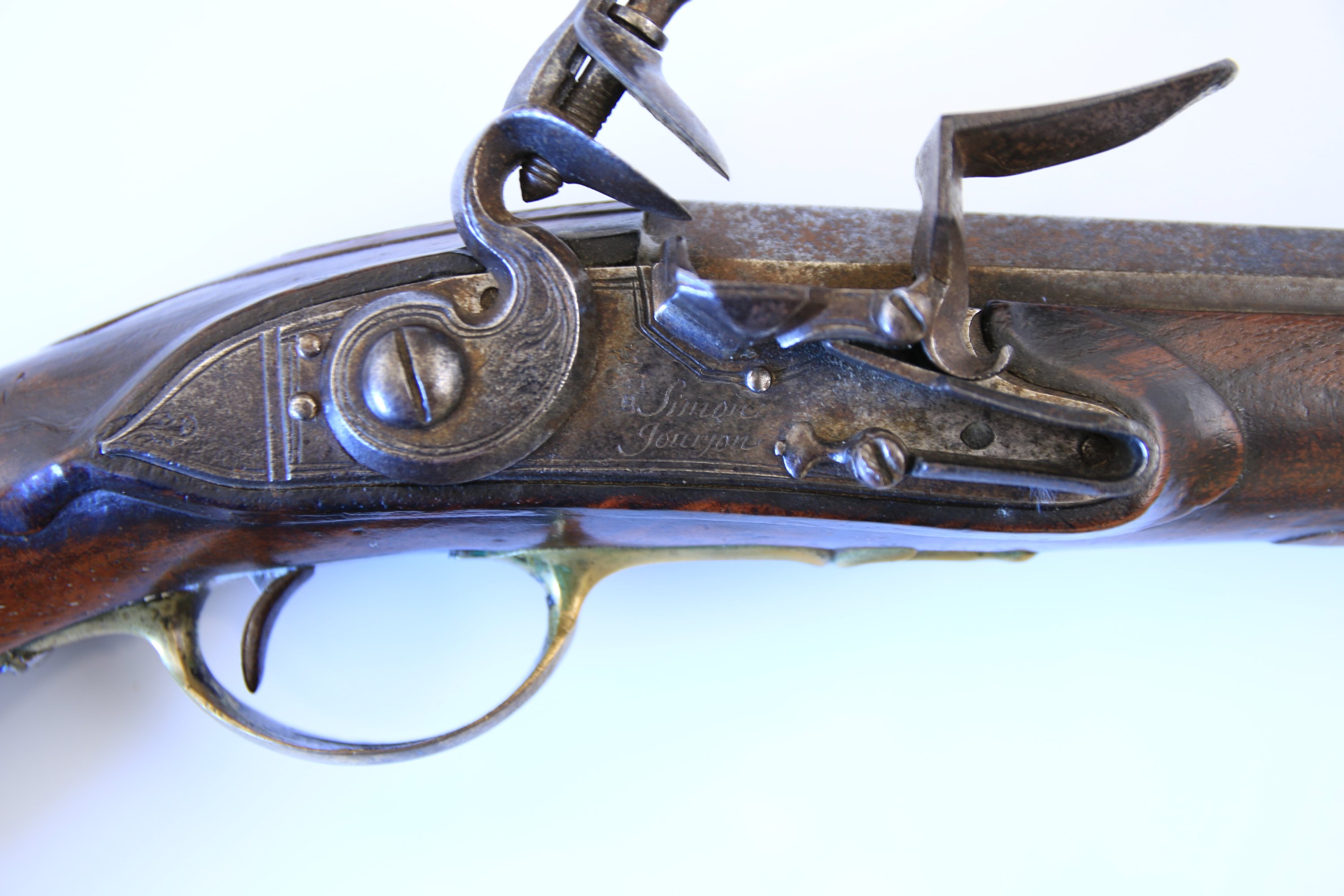 Canons ronds à pans aux tonnerres poinçonnés 19 pour l'un et 961 pour l'autre. Platines poinçonnées de St Etienne et signées de Simon Jourjon ; chiens à corps plat. Garnitures en laiton décoré au trait et calottes à la bombe explosante. Crosses en noyer à embouts en corne, l'une au matricule du canon.