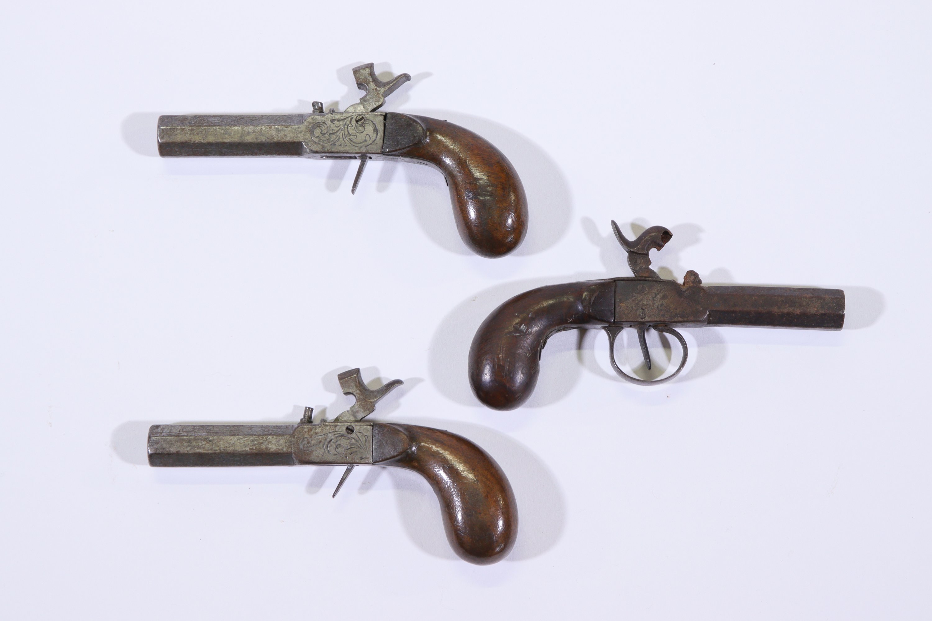 - Une paire de pistolets à coffre à percussion. Canons à pans, coffres gravés. Crosses en noyer.