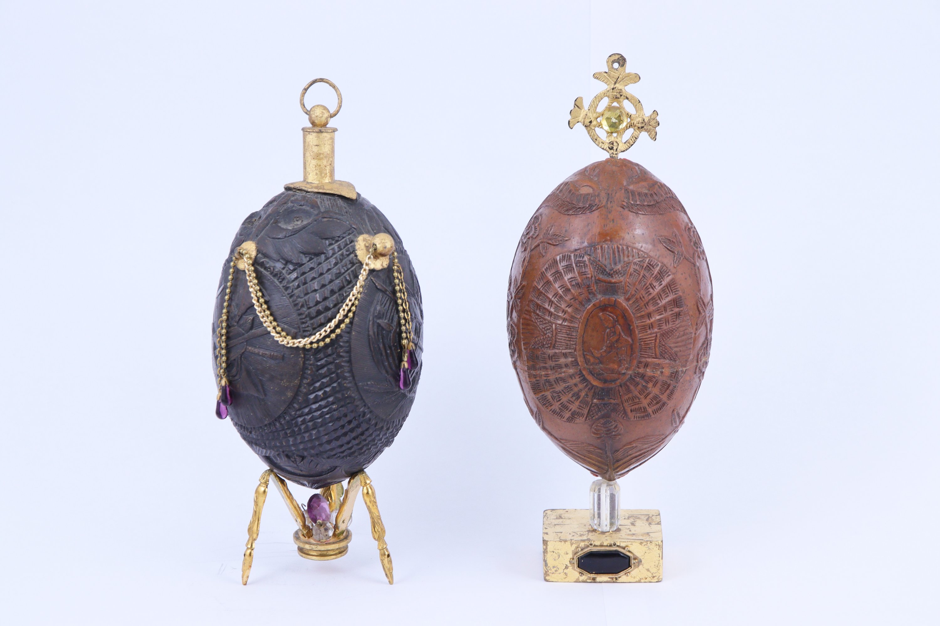 Jointe: demi-noix de coco sculptée à décor d'un homme dans un médaillon surmonté d'une croix. Sur un socle de section carrée. Travail composite. Haut. 13 cm. Haut. totale 21 cm.