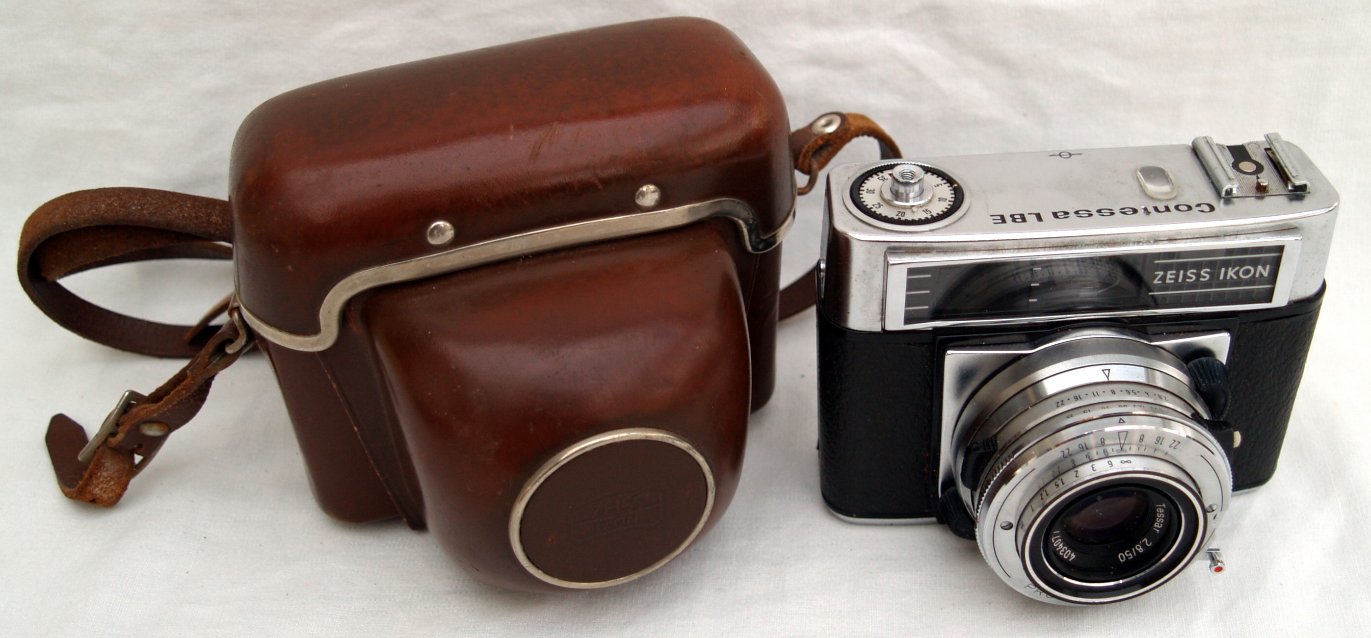 - Zeiss Ikon modèle "Contessa LBE (10.0639), numéroté G 11087. Objectif Carl Zeiss Tessar 2,8/50 mm n°4034077 et film 135 -24x36. Avec son étui en cuir.