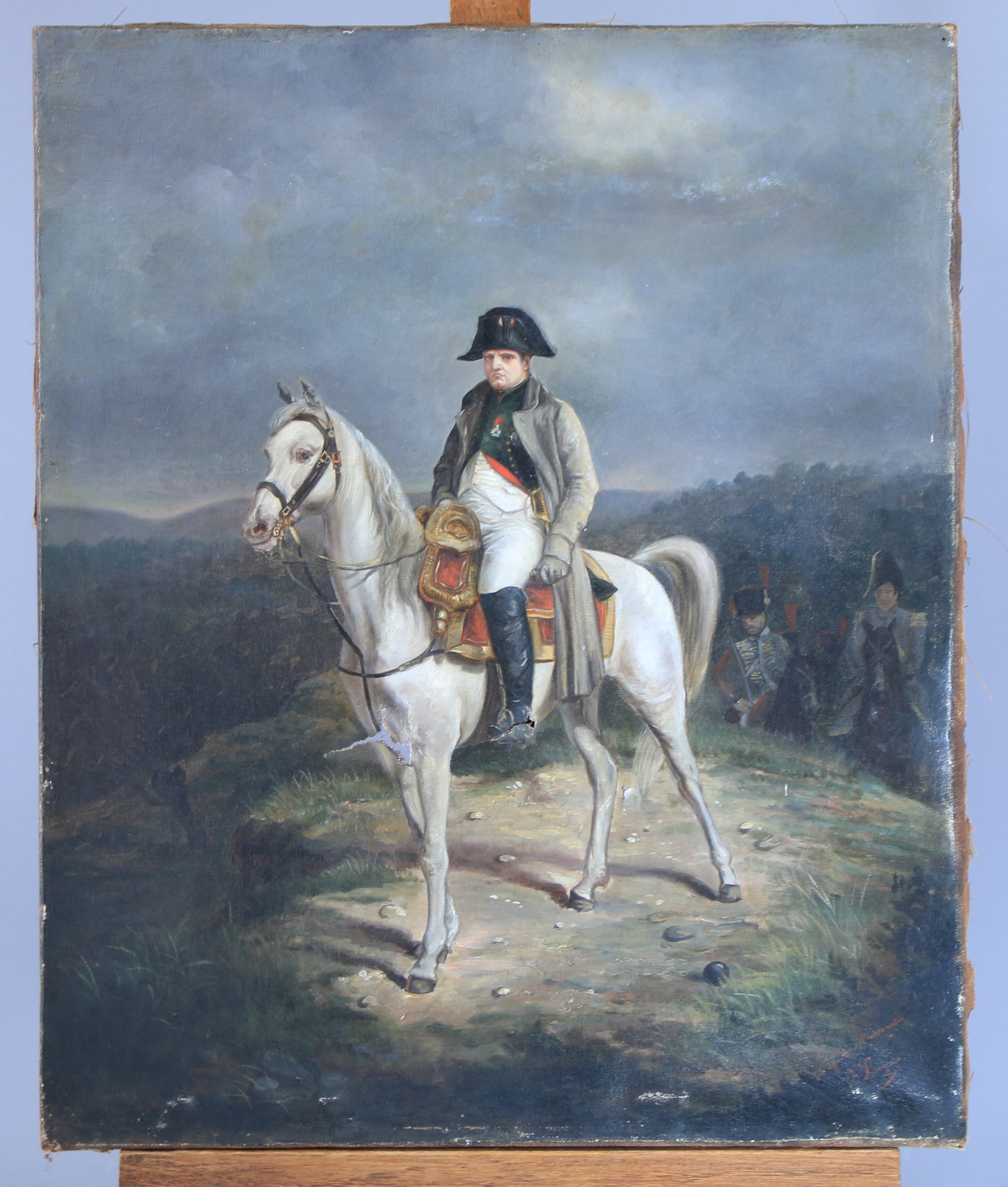 Napoléon Ier sur son cheval blanc Vizir est campé ici pendant la bataille de France, qui coûtera son trône à l'Empereur. Cette image saisissante est réalisée d'après le panneau conservé au Walters Art Museum de Baltimore (n° 21652).