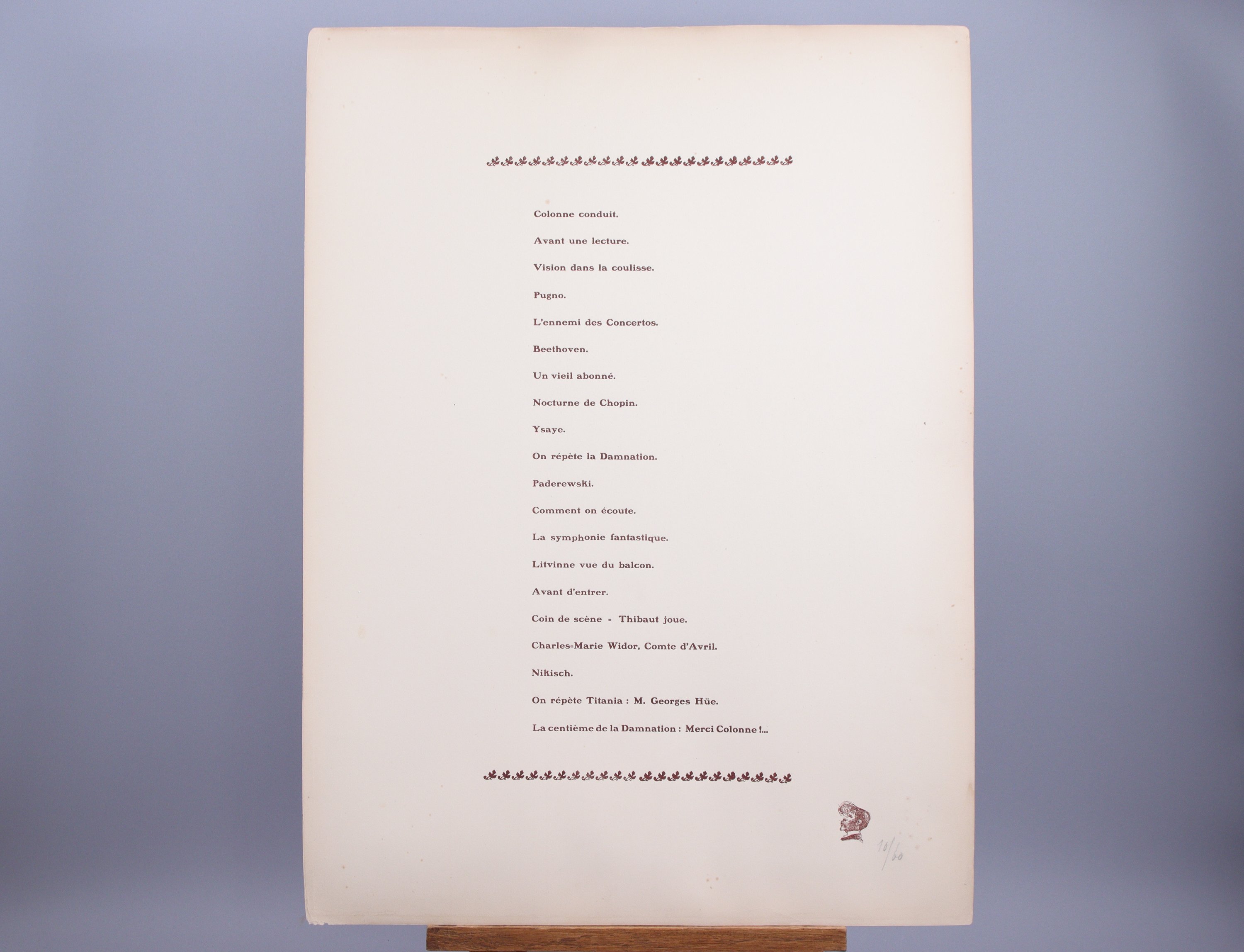 Titre, Faux titre, page annonçant la Table, Table et suite des vingt planches: -Colonne conduit Avant une lecture, Piernie - vision dans la Coulisse Pugno L'Ennemi du Concert Beethoven Un Vieil abonné Nocturne, Chopin Ysaÿe On répète la Damnation Paderewski Comment on écoute Le Songe d'une nuit de Sabbat Litvinne vue du balcon Avant d'entrer Coin de scène, Thibaud joue Charles Marie Widor, Comte d'Avril Nikisch On répète Titania La 100e de la Damnation: Merci Colonne!...