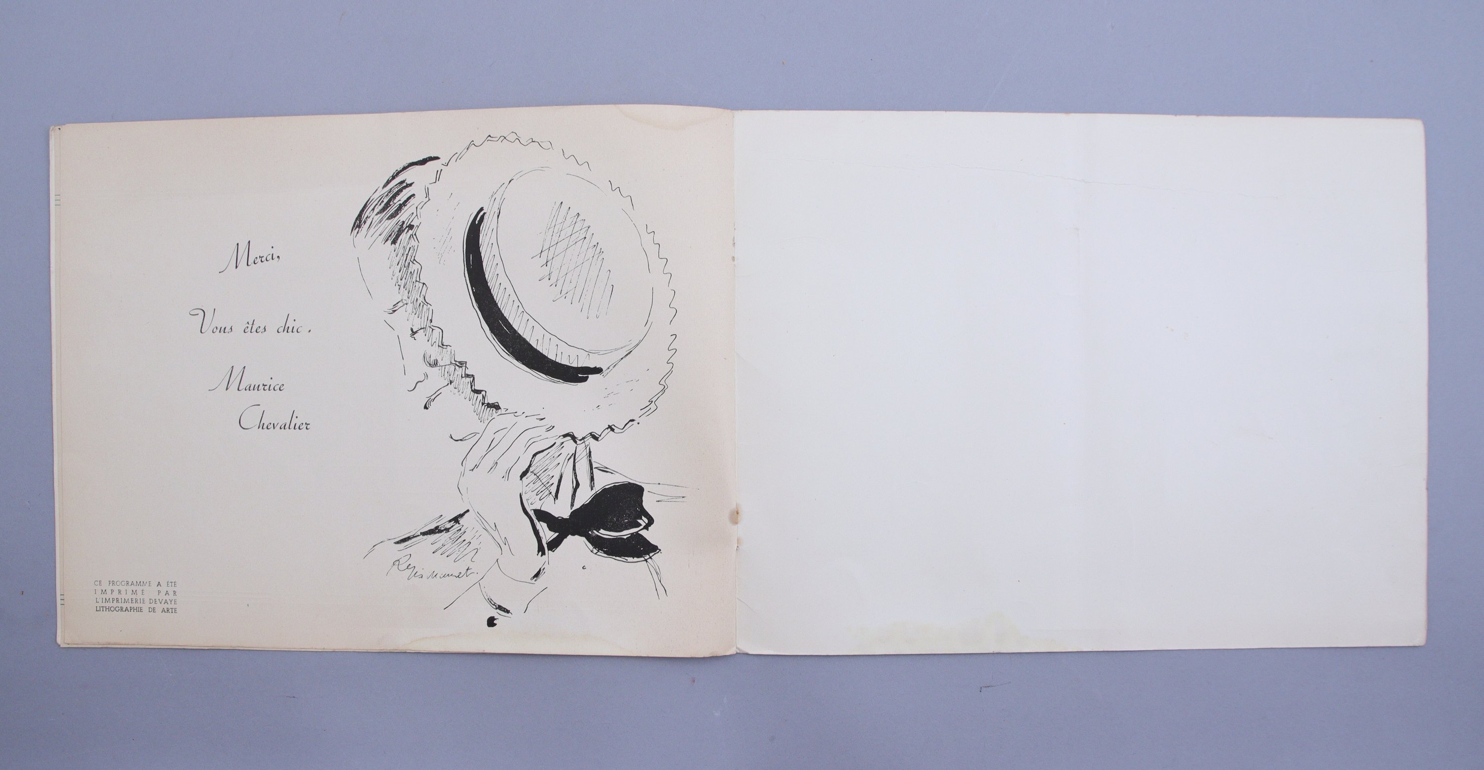 Lithographie en couleurs signée dans la planche, en couverture du programme de la grande soirée Maurice Chevalier le vendredi 14 août 1942 à Cannes.