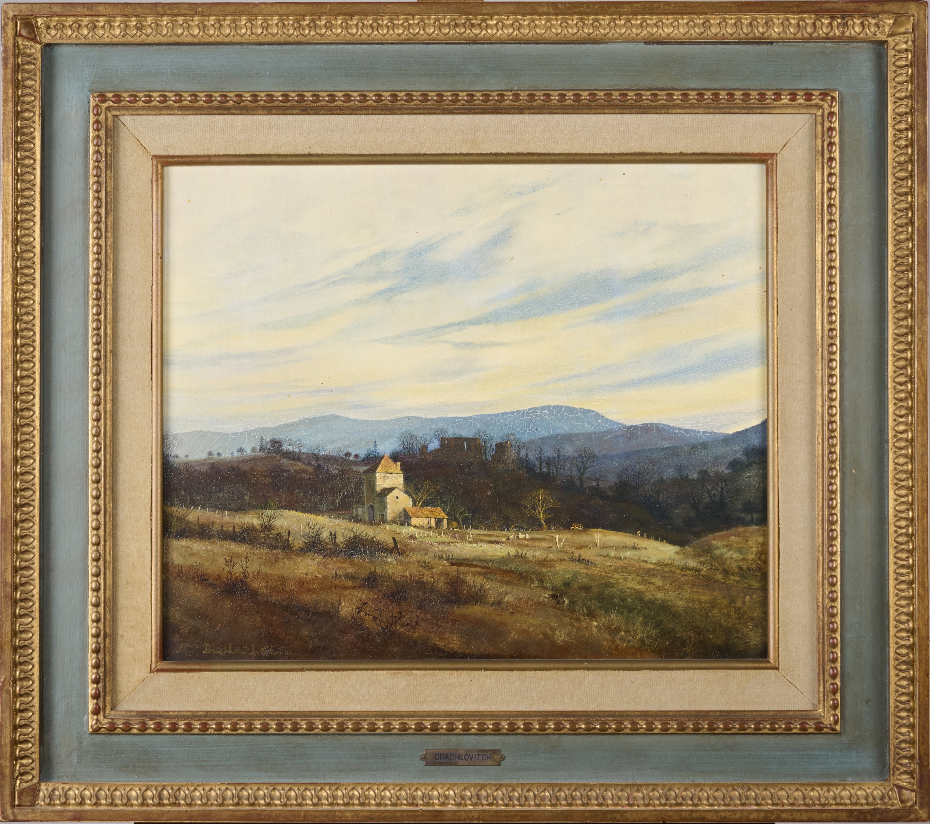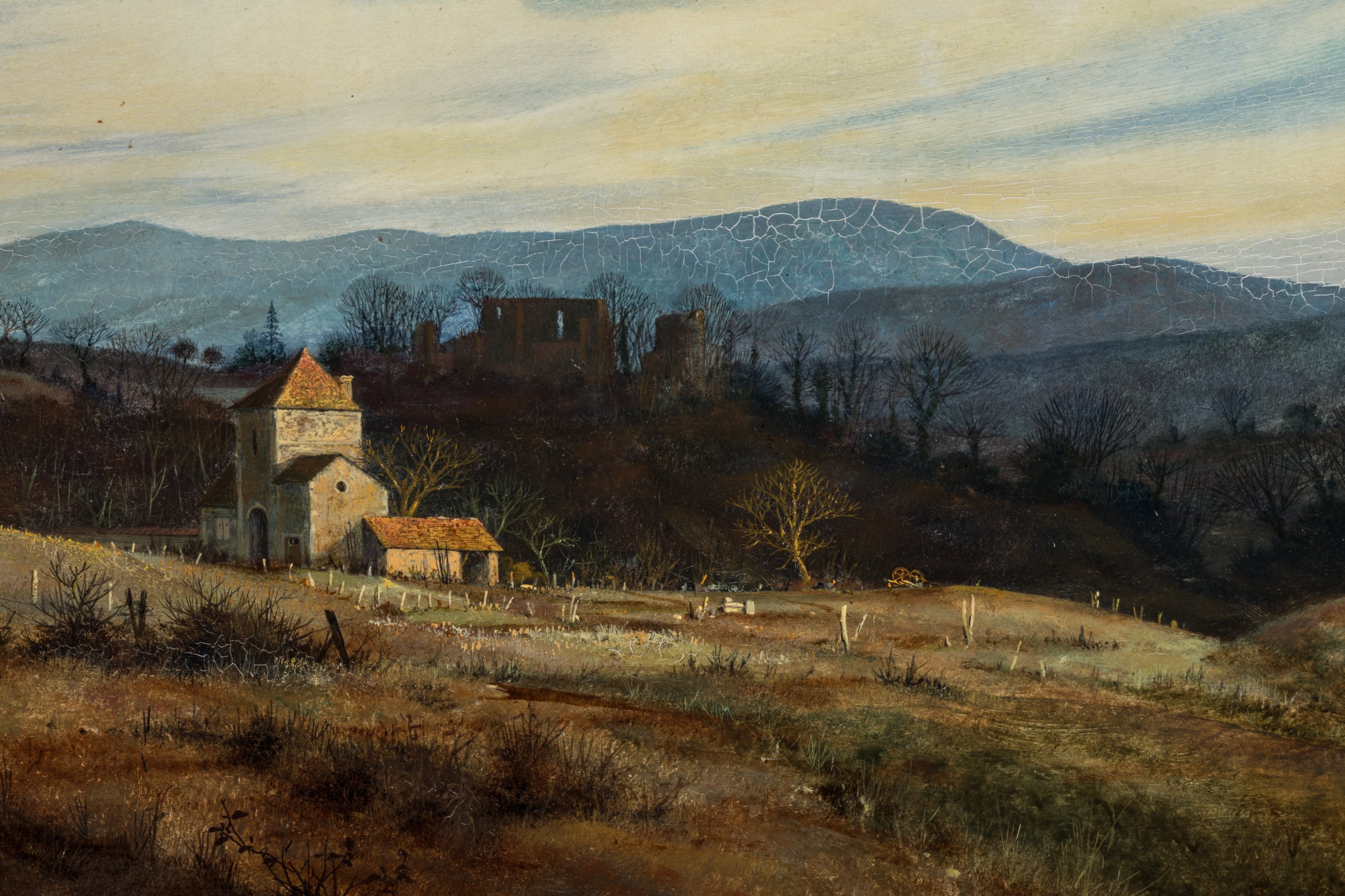 Paysage au prieuré sur une ligne de montagnes bleues