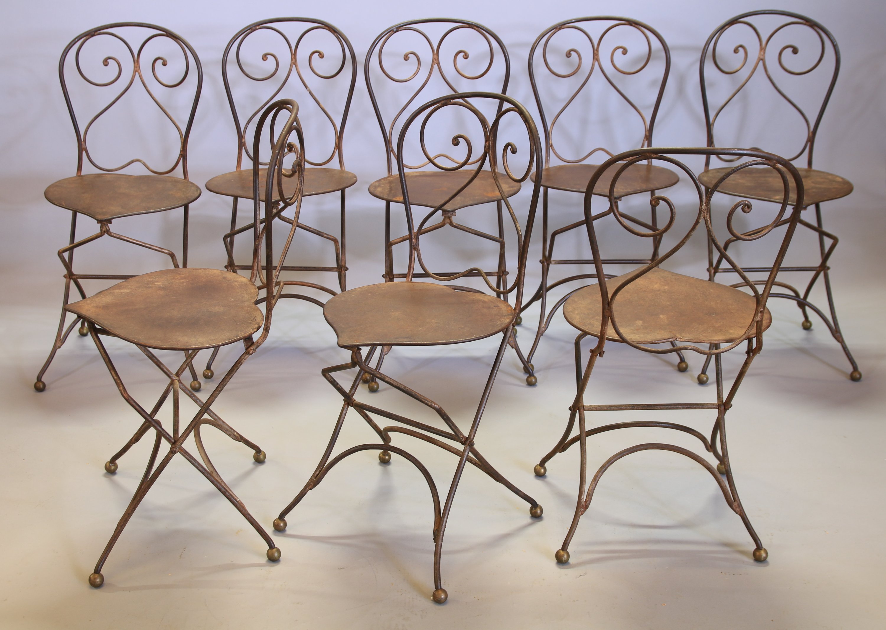 en fer forgé, dossiers ajourés a décor d'enroulement et de coeur, assise en coeur. Elles reposent sur 4 pieds terminés par des boules.