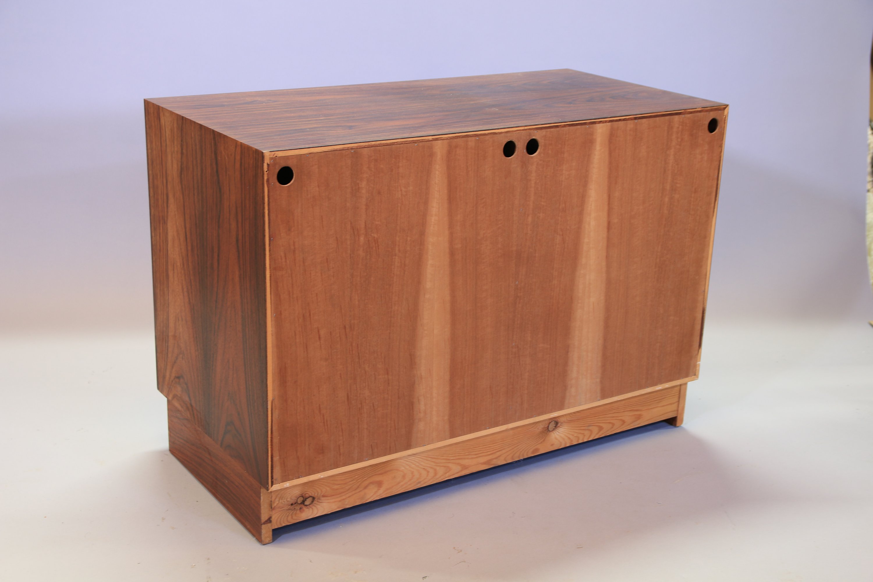 en placage de palissandre. Il ouvre en façade par deux vantaux découvrant quatre niches réglables. Il repose sur une plinthe en retrait.