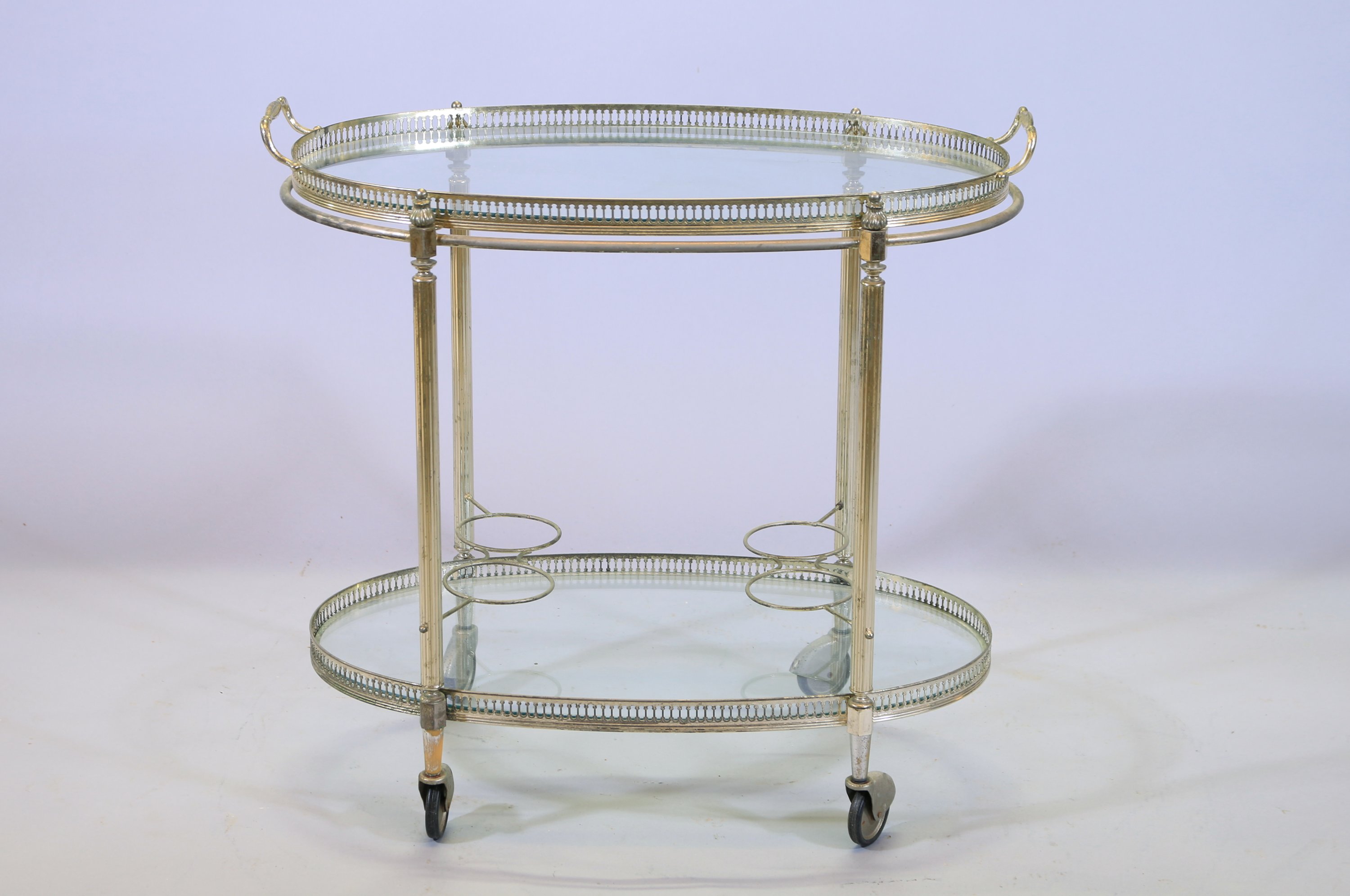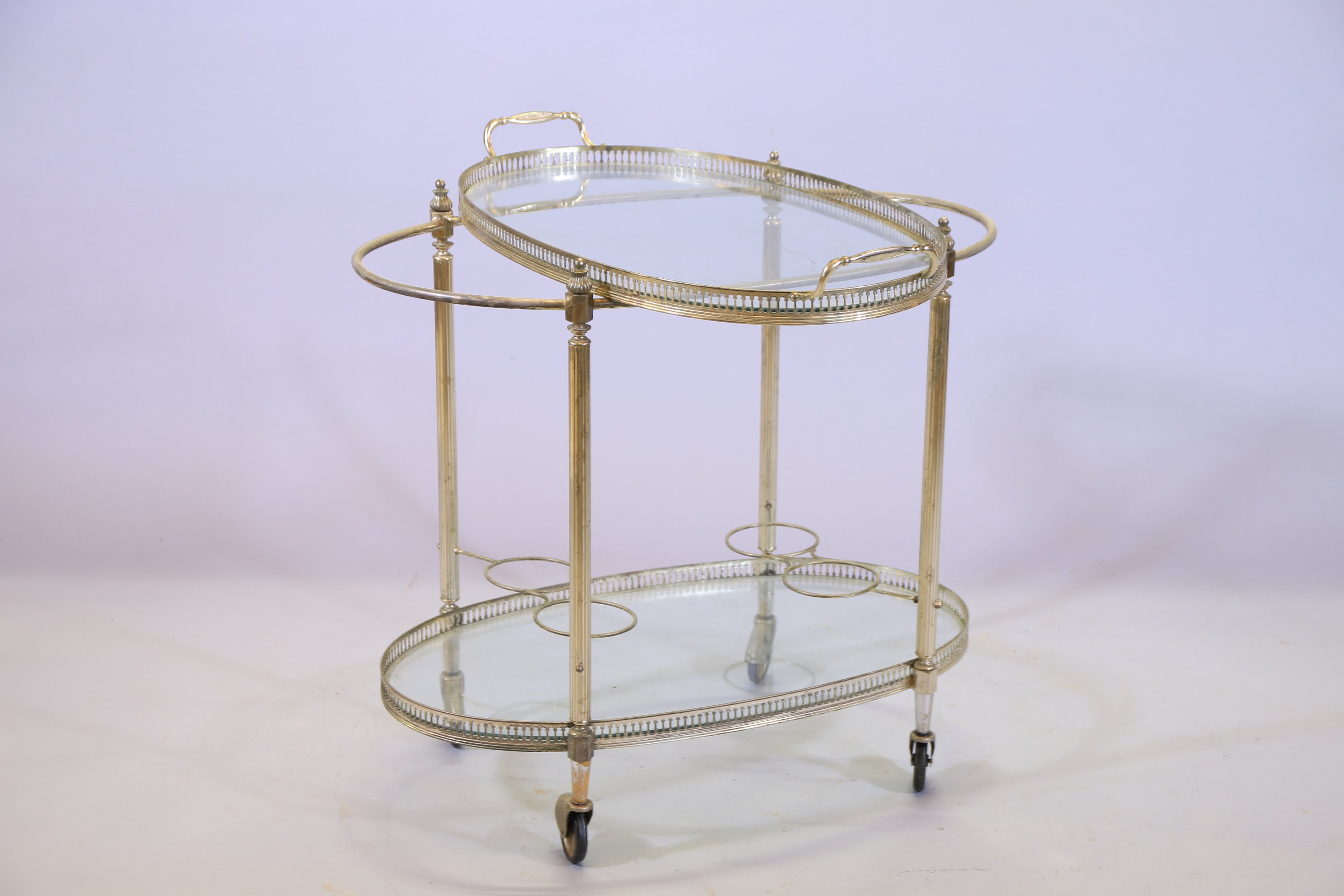 en laiton et verre à deux plateaux. Galerie de laiton argenté ajourée, montants cannelés terminés par des roulettes, le niveau supérieur amovible.