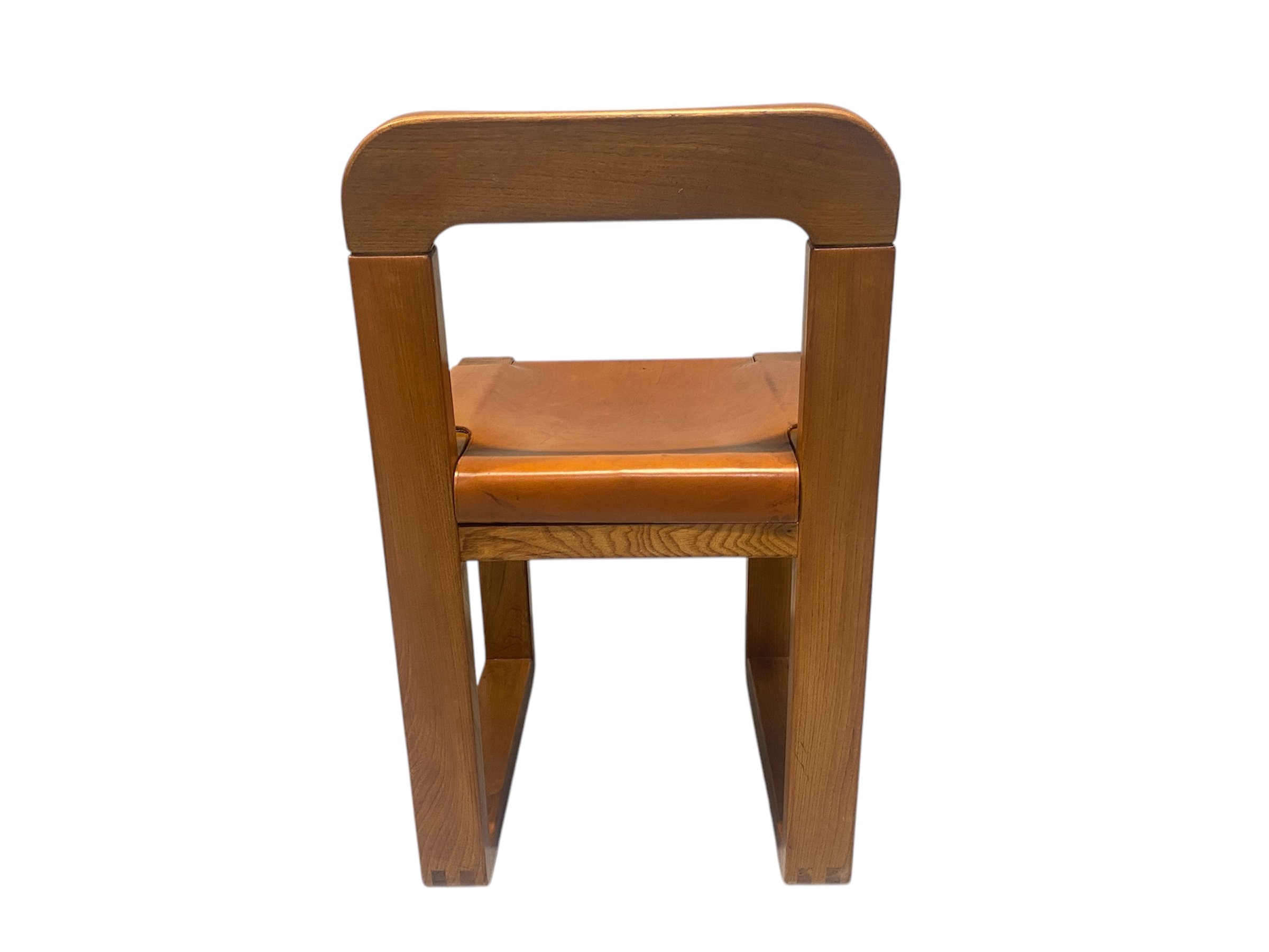 - Les chaises présentent un dossier en bandeau, une assise en cuir fauve et quatre pieds de section rectangulaire réunis par des entrejambes. Haut. 72,5 Larg. 43 Prof. 42 cm.