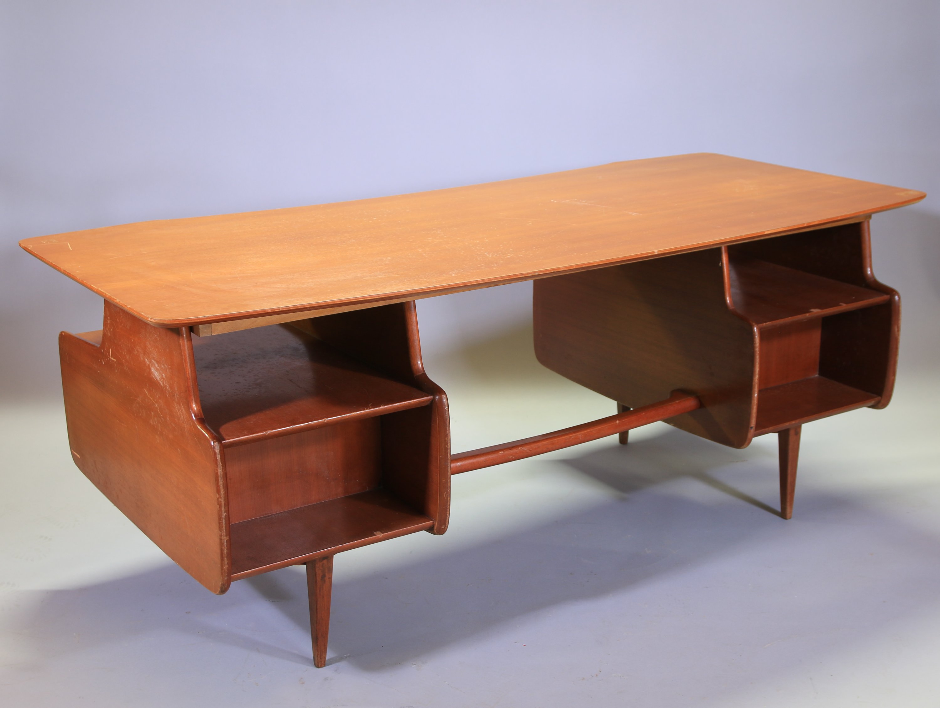 en teck. Il ouvre par deux caissons à deux tiroirs en ceinture et repose sur quatres pieds fuselés.