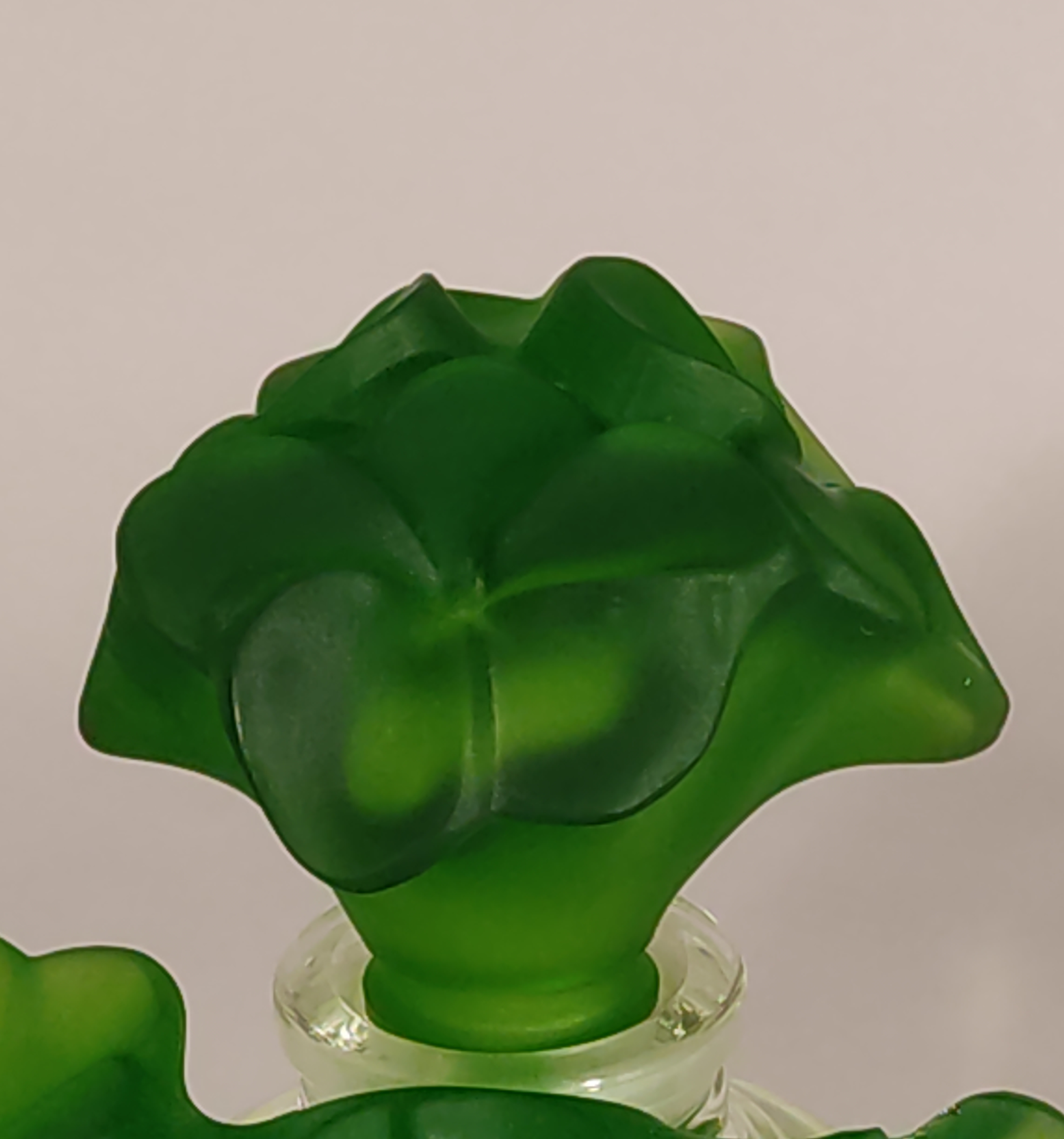 Flacon publicitaire décoratif en verre incolore et verre teinté vert pressé moulé, dessiné par Thierry Lecoule. (liquide factice)