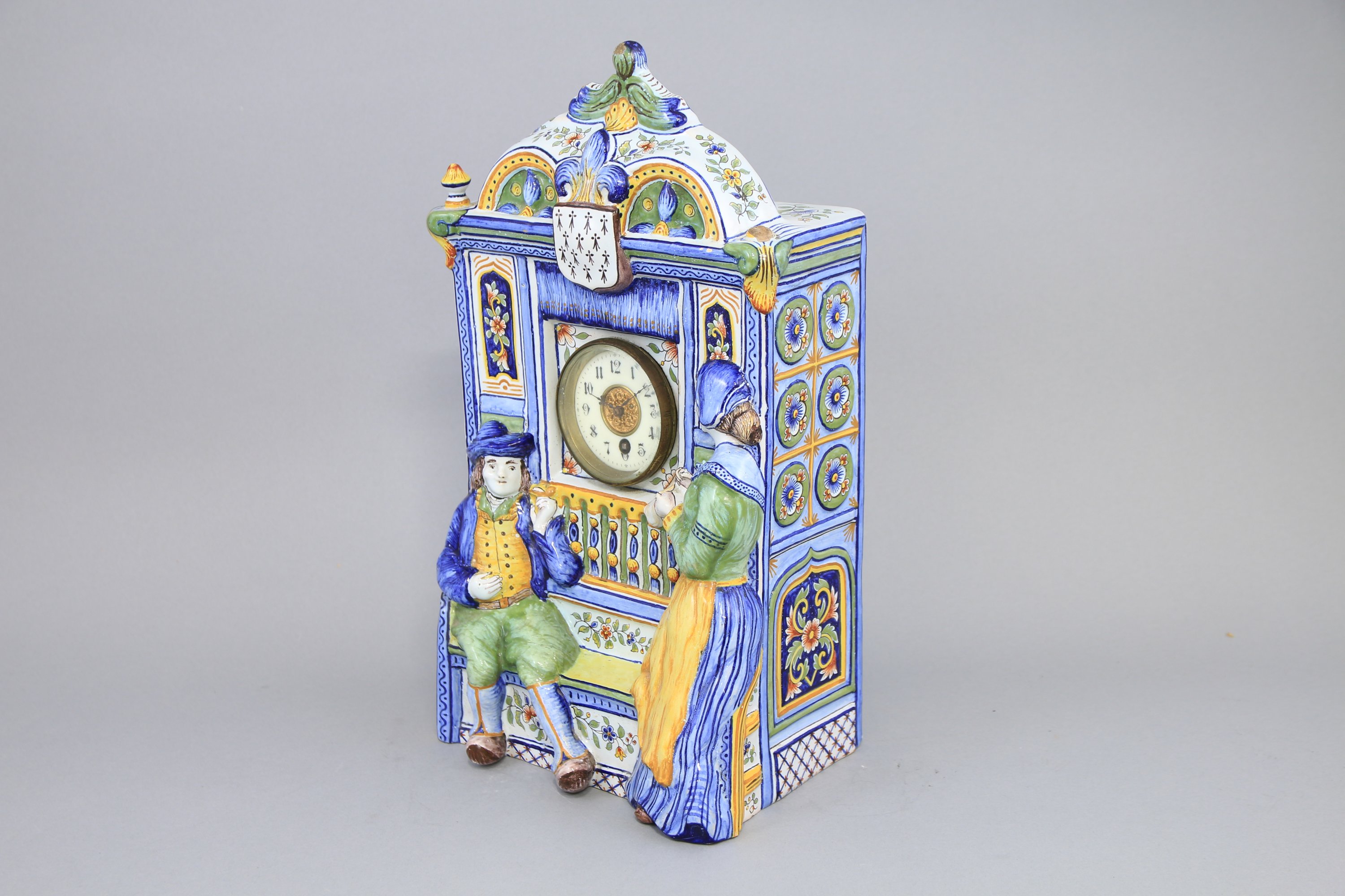 en faïence polychrome. Le cadran émaillé blanc indique les heures en chiffres arabes, les minutes par des bâtonnets. Il est surmonté d'un fronton décoré d'une fleur de lys et un écusson orné de motifs d'hermines et entouré d'un couple de Bretons, l'homme assis sur un banc et la femme cousant. Les côtés présentent une ornementation de caissons.